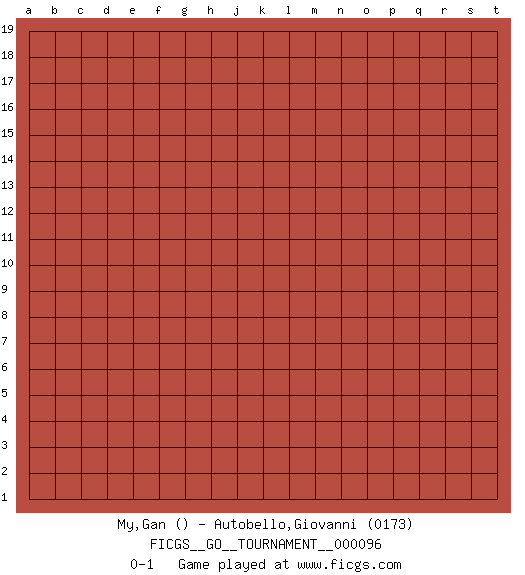 Last move : 0-1 2021 December 29 12:20:46 [Event "FICGS__GO__TOURNAMENT__000096"] [Site "FICGS"] [Date "2021.11.28"] [Round "1"] [Black "My,Gan"] [White "Autobello,Giovanni"] [Result "0-1"] [Rating 2 "0173"] 0-1 This go game has been lost on time (started : 2021.11.28 23:18:13) Here are the names of the openings (joseki) played in the four corners : Player White won this Go (weiqi, baduk) game. Follow this game move after move (download)One point in the center is worth ten in the corner. (Anonymous) It's not the will to win, but the will to prepare to win that makes the difference. (Bear Bryant)