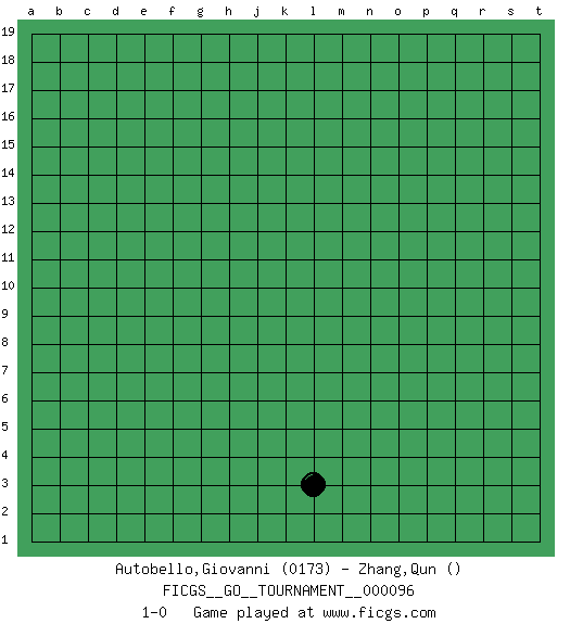 Last move : 1-0 2021 December 31 1:38:42 [Event "FICGS__GO__TOURNAMENT__000096"] [Site "FICGS"] [Date "2021.11.28"] [Round "1"] [Black "Autobello,Giovanni"] [White "Zhang,Qun"] [Result "1-0"] [Rating 1 "0173"] 1.l3 1-0 This go game has been lost on time (started : 2021.11.28 23:18:13) Here are the names of the openings (joseki) played in the four corners : Corner q4 : l3 1-0 This joseki is unknown. A weak or weird move has probably been played in this corner. Player Black won this Go (weiqi, baduk) game. Follow this game move after move (download)Big groups never die. (Anonymous) The bottom line is always the bottom line. (Johann Piek)