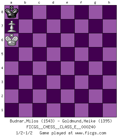 Last move : 1/2-1/2 2022 March 22 15:18:0 [Event "FICGS__CHESS__CLASS_E__000240"] [Site "FICGS"] [Date "2021.11.28"] [Round "1"] [White "Budnar,Milos"] [Black "Goldmund,Heike"] [Result "1/2-1/2"] [WhiteElo "1543"] [BlackElo "1395"] 1.e4 d5 2.exd5 Qxd5 3.Nc3 Qa5 4.d4 Nf6 5.Bb5+ c6 6.Ba4 e6 7.Nge2 Bd6 8.O-O Nbd7 9.a3 Qc7 10.h3 O-O 11.g3 Nb6 12.Bb3 Nbd5 13.Nxd5 cxd5 14.Bg5 Ne4 15.Bf4 Bxf4 16.Nxf4 b6 17.Qd3 Bb7 18.c4 dxc4 19.Qxc4 Qxc4 20.Bxc4 Nd2 21.Rfc1 Nxc4 22.Rxc4 Rfd8 23.Rc7 Be4 24.Rc4 Rac8 25.Rxc8 Rxc8 26.b4 Rc4 27.Ne2 Bf3 28.Kf1 Rc2 29.Ng1 Bd5 30.Ke1 Rc4 31.Ne2 Rc2 32.Rc1 Rxc1+ 33.Nxc1 f6 34.f4 Kf7 35.h4 h6 36.Kf2 a6 37.Ne2 g6 38.Ke3 a5 39.bxa5 bxa5 40.Nc3 Bb3 41.Nb5 Ke7 42.Nc3 a4 43.g4 g5 44.hxg5 hxg5 45.fxg5 fxg5 46.Ne4 Bd1 47.Nf2 Bb3 48.Kf3 Kd6 49.Ke3 Kd5 50.Ne4 e5 51.dxe5 Kxe5 52.Nxg5 Bd1 53.Nf3+ Bxf3 54.Kxf3 Kf6 55.Kf4 Kg6 56.g5 Kg7 57.Kf5 Kf7 58.g6+ Kg7 59.Kg5 Kg8 60.Kh6 Kh8 61.g7+ Kg8 62.Kg5 Kxg7 63.Kf5 Kf7 64.Ke5 Ke7 65.Kd5 Kd7 66.Kc5 Kc7 67.Kb5 Kb7 68.Kxa4 Ka7 69.Kb5 Kb7 70.a4 Ka7 71.a5 Ka8 72.Kb6 Kb8 73.a6 Ka8 74.Kc6 Ka7 75.Kb5 Ka8 76.Kb6 Kb8 77.a7+ Ka8 78.Ka6 1/2-1/2 Scandinavian (centre counter) defense Kingside Castling by player White (move 8) Kingside Castling by player Black (move 10) 10 pieces endgame at move 45 : White KNPPP , Black KBPPP WHITE : King + 1 Knight 3 Pawns BLACK : King + 1 Bishop 3 Pawns 9 pieces endgame at move 51 : White KNPPP , Black KBPP WHITE : King + 1 Knight 3 Pawns BLACK : King + 1 Bishop 2 Pawns 8 pieces endgame at move 51 : White KNPP , Black KBPP WHITE : King + 1 Knight 2 Pawns BLACK : King + 1 Bishop 2 Pawns 7 pieces endgame at move 52 : White KNPP , Black KBP WHITE : King + 1 Knight 2 Pawns BLACK : King + 1 Bishop 1 Pawn 6 pieces endgame at move 53 : White KPP , Black KBP WHITE : King + 2 Pawns BLACK : King + 1 Bishop 1 Pawn 5 pieces endgame at move 54 : White KPP , Black KP WHITE : King + 2 Pawns BLACK : King + 1 Pawn 4 pieces endgame at move 62 : White KP , Black KP WHITE : King + 1 Pawn BLACK : King + 1 Pawn 3 pieces endgame at move 68 : White KP , Black K WHITE : King + 1 Pawn BLACK : King + This chess game ended in a draw. Follow this game move after move (download)If I win a tournament, I win it by myself. I do the playing. Nobody helps me. (Bobby Fischer) Die meiste Zeit treffe ich auf Gegner, die meine Enkel sein könnten. Ich bin da, um ihnen zu zeigen, dass sie von mir noch einiges lernen können. (Viktor Kortschnoi) Cuando le juegas a Fischer, no es una cuestion de si vas a ganar o perder. Es una cuestion de si vas a sobrevivir. (Boris Spassky) Je crois qu'il existe des manières très spécifiques de jouer efficacement contre une machine. Evidemment, nous n'avons aucune chance en technique pure, parce que l'ordinateur calcule de manière parfaite. Mais lorsque nous faisons appel à notre cerveau, en utilisant l'intuition et la compréhension, alors nous restons beaucoup plus forts. (Anatoli Karpov) A clear conscience is usually the sign of a bad memory. (Unknown)