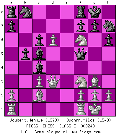 Last move : 1-0 2022 January 5 15:54:53 [Event "FICGS__CHESS__CLASS_E__000240"] [Site "FICGS"] [Date "2021.11.28"] [Round "1"] [White "Joubert,Hennie"] [Black "Budnar,Milos"] [Result "1-0"] [WhiteElo "1379"] [BlackElo "1543"] 1.e4 e5 2.Bc4 Nf6 3.d4 exd4 4.Nf3 Bb4+ 5.c3 dxc3 6.bxc3 Bc5 7.O-O h6 8.e5 Nh7 9.Qd5 Qe7 10.Bf4 O-O 11.Nbd2 c6 12.Qd3 b5 13.Bb3 d5 14.exd6 Qf6 15.Bg3 Be6 16.Ne4 Qf5 17.Bc2 Bc4 18.Nf6+ 1-0 Bishop's Opening : Urusov gambit Kingside Castling by player White (move 7) Kingside Castling by player Black (move 10) Player White won this chess game. Follow this game move after move (download)Chess is a fairy tale of 1001 blunders. (Savielly Tartakower) Alles was am Schachbrett zählt sind gute Züge. (Robert James Fischer) El Jaque al descubierto es el bombardero del tablero. (Reuben Fine) Je ne suis pas le dernier à jouer lâchement des coups douteux pendant le zeïtnot de l'adversaire pour l'achever: en effet les coups qui font le plus peur sont ceux que l'on ne comprend pas. Je me fais souvent peur quand je joue. (Un professeur anonyme) Life is like a game of cards: the hand you are dealt represents determinism; the way you play it is free will. (Jawaharlal Nehru)