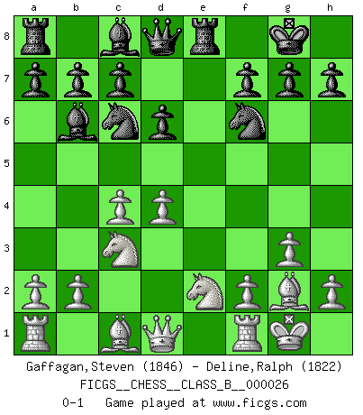Last move : 0-1 2007 September 8 19:31:41 [Event "FICGS__CHESS__CLASS_B__000026"] [Site "FICGS"] [Date "2007.07.25"] [Round "1"] [White "Gaffagan,Steven"] [Black "Deline,Ralph"] [Result "0-1"] [WhiteElo "1846"] [BlackElo "1822"] 1.c4 e5 2.Nc3 Nc6 3.g3 Nf6 4.Bg2 Bc5 5.e3 d6 6.Nge2 Bb6 7.d4 O-O 8.O-O exd4 9.exd4 Re8 0-1 This chess game has been lost on time (started : 2007.07.25 0:43:9) English : Sicilian Reversed Kingside Castling by player Black (move 7) Kingside Castling by player White (move 8) Player Black won this chess game. Follow this game move after move (download)One bad move nullifies forty good ones. (Horowitz) Der beste Spieler in einem Turnier gewinnt es nie. Er landet auf Platz zwei oder drei. (Siegbert Tarrasch) El Ajedrez es un invernadero donde los frutos del carácter pueden madurar mas completamente que en la vida. (Edward Morgan Foster) J'ai toujours senti une vague pitié pour l'homme qui ne connaît rien aux échecs, tout comme j'en aurais pour un homme ignorant de l'amour. Les Echecs, comme la musique ou comme l'amour, ont le pouvoir de rendre heureux. (Siegbert Tarrasch) Life is like a ten-speed bicycle: most of us have gears we never use. (Charles M. Schulz)
