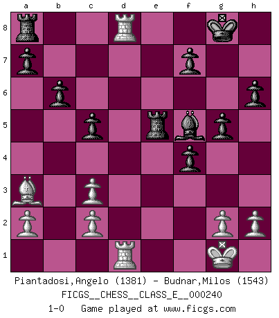 Last move : 1-0 2021 December 27 20:26:36 [Event "FICGS__CHESS__CLASS_E__000240"] [Site "FICGS"] [Date "2021.11.28"] [Round "1"] [White "Piantadosi,Angelo"] [Black "Budnar,Milos"] [Result "1-0"] [WhiteElo "1381"] [BlackElo "1543"] 1.e4 e5 2.f4 exf4 3.Bc4 Nf6 4.Nc3 Bb4 5.d3 Bxc3+ 6.bxc3 g5 7.Nf3 h6 8.Ne5 d5 9.exd5 Nxd5 10.Bxd5 Qxd5 11.Qe2 O-O 12.Ba3 Re8 13.d4 Nc6 14.O-O Nxe5 15.dxe5 Rxe5 16.Qf3 Qxf3 17.Rxf3 Bg4 18.Rd3 Bf5 19.Rd2 c5 20.Rad1 b6 21.Rd8+ 1-0 KGA : Bishop's gambit, Bogolyubov variation Kingside Castling by player Black (move 11) Kingside Castling by player White (move 14) Player White won this chess game. Follow this game move after move (download)We like to think. (Gary Kasparov) Schach ist das schnellste Spiel der Welt, weil man in jeder Sekunde Tausende von Gedanken ordnen muß. (Albert Einstein) Un jugador que trata de regresar una movida en el Ajedrez es un futuro carterista. (Richard Fenton) Horreur, mais aussi harmonie suprême : qu'y avait-il en effet au monde en dehors des échecs ? Le brouillard, l'inconnu, le non-être... (Vladimir Nabokov) When a man with money meets a man with experience, the man with experience leaves with money and the man with money leaves with experience. (Anonymous)