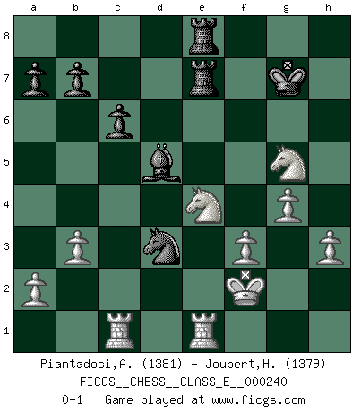 Last move : 0-1 2022 February 16 1:24:47 [Event "FICGS__CHESS__CLASS_E__000240"] [Site "FICGS"] [Date "2021.11.28"] [Round "1"] [White "Piantadosi,Angelo"] [Black "Joubert,Hennie"] [Result "0-1"] [WhiteElo "1381"] [BlackElo "1379"] 1.d4 Nf6 2.c4 g6 3.Nc3 Bg7 4.e4 d6 5.Nf3 O-O 6.Be2 e5 7.dxe5 dxe5 8.O-O c6 9.h3 Nh5 10.Be3 f5 11.exf5 Bxf5 12.Ng5 Bd7 13.Bxh5 gxh5 14.Qxh5 h6 15.Nge4 Be6 16.Bxh6 Bxh6 17.Qxh6 Qe7 18.Ng5 Bxc4 19.Rfe1 Nd7 20.Nce4 Qg7 21.Qxg7+ Kxg7 22.Rac1 Bd5 23.b3 Rae8 24.Nd6 Re7 25.g4 e4 26.Ndxe4 Rfe8 27.f3 Ne5 28.Kf2 Nd3+ 0-1 King's Indian : Andersson variation Kingside Castling by player Black (move 5) Kingside Castling by player White (move 8) Player Black won this chess game. Follow this game move after move (download)The Chess pieces are the block alphabet which shapes thoughts; and these thoughts, although making a visual design on the chessboard, express their beauty abstractly, like a poem. (Marcel Duchamp) Mein Gehirn das ist mein zweitwichtigstes Organ [Aus dem Film: Der Schläfer]. (Woody Allen) Si tu oponente no puede hacer nada activo, entonces no apures la posición; En vez de eso, dejalo estar sentado ahí, sufriendo y rogandote por un empate. (Jeremy Silman) Les échecs, c'est la lutte contre l'erreur. (Johannes Zukertort) You cannot beat a roulette table unless you steal money from it. (Albert Einstein)