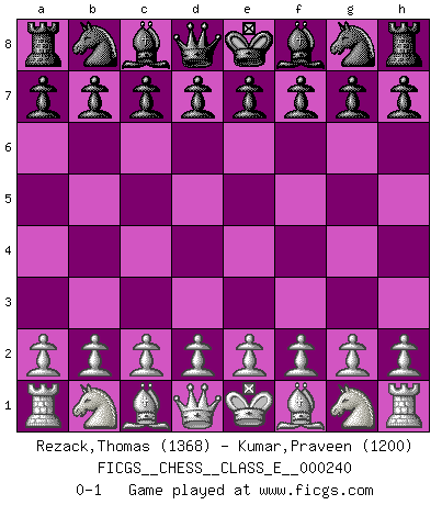 Last move : 0-1 2022 January 8 13:2:0 [Event "FICGS__CHESS__CLASS_E__000240"] [Site "FICGS"] [Date "2021.11.28"] [Round "1"] [White "Rezack,Thomas"] [Black "Kumar,Praveen"] [Result "0-1"] [WhiteElo "1368"] [BlackElo "1200"] 0-1 This chess game has been lost on time (started : 2021.11.28 23:18:49) Player Black won this chess game. Follow this game move after move (download)Chess is life. (Bobby Fischer) Über die Verhaftung Bobby Fischers: Warum es die Bush-Administration für nötig befindet einen 61 Jahre alten Mann zu hetzten, der für niemanden ausser sich selbste eine Gefahr darstellt ist ein Rätsel. (Nigel Short) El Ajedrez es en su esencia, un juego. En su forma, un arte. Y en su ejecución, una ciencia. (Baron Tassilo) Un millionnaire : 'Monsieur Steinitz ! Vous ne participez aux tournois que pour l'argent, alors que moi je n'y viens que pour l'honneur.' Steinitz : 'Chacun joue pour ce qu'il n'a pas'... The beginning of wisdom is silence. The second step is listening. (Unknown)