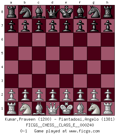 Last move : 0-1 2022 January 8 13:2:0 [Event "FICGS__CHESS__CLASS_E__000240"] [Site "FICGS"] [Date "2021.11.28"] [Round "1"] [White "Kumar,Praveen"] [Black "Piantadosi,Angelo"] [Result "0-1"] [WhiteElo "1200"] [BlackElo "1381"] 0-1 This chess game has been lost on time (started : 2021.11.28 23:18:49) Player Black won this chess game. Follow this game move after move (download)What is the difference between chess and football? Everybody understands football, but nobody plays it. Everybody plays chess, but nobody understands it. Everything is relative. (Vladimir Kramnik) Als er Schachweltmeister wurde ließ er praktisch alle stärksten Sovietspieler für sich arbeiten. Wenn ein auch nur mittelmässiger Meister ein Spezialist für eine bestimmte Eröffnung war, wurde er von Karpov gerufen. Das wurde alles geheim gehalten. (Mikhail Moiseyevich Botvinik) Me siento como si fuera una pieza en una partida de Ajedrez, cuando mi oponente me indica: esa pieza no puede ser movida. (Soren Kierkegaard) A chaque perte on perd un peu de soi. (Joël Lautier) If you have any trouble condescending, find a Unix user to show you how it's done. (Scott Adams)