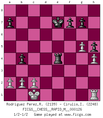 Last move : 1/2-1/2 2022 February 10 0:9:23 [Event "FICGS__CHESS__RAPID_M__000126"] [Site "FICGS"] [Date "2021.12.02"] [Round "1"] [White "Rodriguez Perez,Rene"] [Black "Cirulis,Ilmars"] [Result "1/2-1/2"] [WhiteElo "2139"] [BlackElo "2248"] 1.e4 c5 2.Nf3 d6 3.d4 cxd4 4.Qxd4 Nc6 5.Bb5 Bd7 6.Bxc6 Bxc6 7.Nc3 Nf6 8.Bg5 e6 9.Bxf6 Qxf6 10.Qe3 Be7 11.O-O-O O-O 12.Kb1 Rfc8 13.g4 b5 14.g5 Qg6 15.h4 h5 16.Nd4 b4 17.Nxc6 Rxc6 18.Ne2 d5 19.Nd4 Rc5 20.exd5 Rxd5 21.Nc6 Bd6 22.Qf3 Rc8 23.Rxd5 exd5 24.Qxd5 Bf8 25.Nd4 Qb6 26.Qe4 Rd8 27.Nc6 Qb7 28.f3 Rc8 29.Ne5 Qxe4 30.fxe4 Re8 31.Nd7 Rxe4 32.Nxf8 Kxf8 33.Kc1 Ke7 1/2-1/2 Sicilian, Chekhover variation Queenside Castling by player White (move 11) Kingside Castling by player Black (move 11) This chess game ended in a draw. Follow this game move after move (download)You can only get good at Chess if you love the game. (Bobby Fischer) Als ich elf wurde, wurde ich einfach gut. (Robert James Fischer) Fischer no está bajo la obligación de nadie. (Joseph Platz) Comme les marins qui ont mille raisons différentes d'aller en mer, les joueurs d'échecs en ont tout autant avant de s'installer devant une table et jouer... (Vincent Bertignac, philosophe) He who fights with monsters should be careful lest he thereby become a monster. (Friedrich Nietzsche, Beyond Good and Evil)