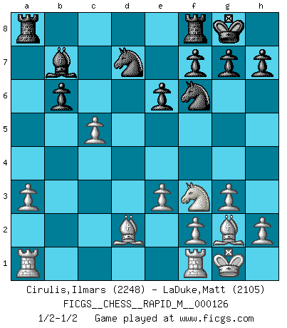 Last move : 1/2-1/2 2021 December 20 2:29:55 [Event "FICGS__CHESS__RAPID_M__000126"] [Site "FICGS"] [Date "2021.12.02"] [Round "1"] [White "Cirulis,Ilmars"] [Black "LaDuke,Matt"] [Result "1/2-1/2"] [WhiteElo "2248"] [BlackElo "2105"] 1.d4 Nf6 2.c4 e6 3.g3 Bb4+ 4.Nd2 O-O 5.Ngf3 d5 6.Bg2 dxc4 7.a3 Bxd2+ 8.Bxd2 Nc6 9.e3 b5 10.b3 Bb7 11.bxc4 bxc4 12.O-O Nb8 13.Qc2 Nbd7 14.Qxc4 c5 15.Qb5 Qb6 16.Qxb6 axb6 17.dxc5 1/2-1/2 Catalan Opening Kingside Castling by player Black (move 4) Kingside Castling by player White (move 12) This chess game ended in a draw. Follow this game move after move (download)The stomach is an essential part of the Chess master. (Bent Larsen) Ein Schachgenie ist jemand der verdammt gut Schach spielt. (Jonathan Levitt) Por tratar de evitar la pérdida de una pieza, muchas personas han perdido una partida de Ajedrez. (Savielly Tartakover) Le plus grand jeu de l'esprit jamais inventé, plus vous l'apprenez, plus vous y prenez du plaisir. (Garry Kasparov) There's no money in correspondence chess. (John Knudsen)