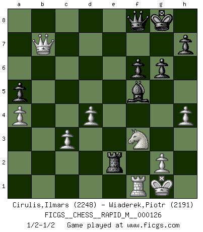 Last move : 1/2-1/2 2022 January 12 5:35:40 [Event "FICGS__CHESS__RAPID_M__000126"] [Site "FICGS"] [Date "2021.12.02"] [Round "1"] [White "Cirulis,Ilmars"] [Black "Wiaderek,Piotr"] [Result "1/2-1/2"] [WhiteElo "2248"] [BlackElo "2191"] 1.d4 d5 2.c4 e6 3.Nf3 Nf6 4.Nc3 Bb4 5.Bg5 Nbd7 6.e3 c5 7.cxd5 exd5 8.Bd3 Qa5 9.Qc2 c4 10.Bf5 O-O 11.O-O Re8 12.Nd2 g6 13.Bxd7 Nxd7 14.h4 f6 15.Bf4 Bxc3 16.bxc3 Nb6 17.f3 Qa4 18.Qb1 Bd7 19.a3 Re6 20.e4 Rae8 21.Bc7 Qc6 22.Bg3 a5 23.Qc2 Nc8 24.a4 Nd6 25.Rfe1 dxe4 26.Bxd6 Qxd6 27.fxe4 Qf4 28.Re2 Bc6 29.Qa2 Bxe4 30.Qxc4 Bf5 31.Rf1 Qd6 32.Rxe6 Rxe6 33.Qc8+ Qf8 34.Qxb7 Re2 35.Nf3 1/2-1/2 Queen's gambit declined Kingside Castling by player Black (move 10) Kingside Castling by player White (move 11) This chess game ended in a draw. Follow this game move after move (download)A bad day of Chess is better than any good day at work. (Anonymous) Es gibt Leute, die glauben, alles wäre vernünftig, was man mit einem ernsthaften Gesicht tut. (Georg Christoph Lichtenberg) Si un gobernante no entiende al Ajedrez, ¿como puede governar él un reinado?. (El Rey Khusros II) Les échecs sont utiles à l'exercice de la faculté de penser et à celle de l'imagination. Car nous devons posséder une méthode élaborée pour atteindre des buts partout où nous devons conduire notre raison. (Leibnitz) Fortune favours the audacious. (Desiderius Erasmus)