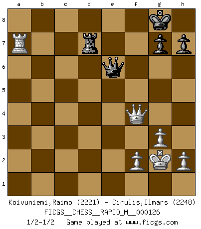 Last move : 1/2-1/2 2022 February 5 14:20:29 [Event "FICGS__CHESS__RAPID_M__000126"] [Site "FICGS"] [Date "2021.12.02"] [Round "1"] [White "Koivuniemi,Raimo"] [Black "Cirulis,Ilmars"] [Result "1/2-1/2"] [WhiteElo "2221"] [BlackElo "2248"] 1.d4 d5 2.c4 c6 3.g3 e6 4.Nf3 Nf6 5.Bg2 Be7 6.O-O O-O 7.b3 Nbd7 8.Nc3 b6 9.Bb2 Ba6 10.Qd3 Qc7 11.e4 dxc4 12.bxc4 e5 13.Ne2 exd4 14.Nexd4 Nc5 15.Qc2 Nfxe4 16.Rfe1 f5 17.Nd2 Bf6 18.N2b3 Qf7 19.Nxc5 Bxd4 20.Nxe4 Bxb2 21.Nd6 Qf6 22.Rad1 Bc3 23.Re2 Rad8 24.Bxc6 Bxc4 25.Nxc4 Qxc6 26.Rxd8 Rxd8 27.Ne5 Qc7 28.Nf3 b5 29.Re3 Ba5 30.Qe2 Qc6 31.Re6 Qd7 32.Kg2 Bb4 33.Re5 a6 34.a4 Bc3 35.Re7 Qc8 36.axb5 Bf6 37.Ra7 axb5 38.Qxb5 f4 39.Ng5 Bxg5 40.Qxg5 Qc6+ 41.Kh3 Rd7 42.Qxf4 Qe6+ 43.Kg2 1/2-1/2 QGD Slav defense Kingside Castling by player White (move 6) Kingside Castling by player Black (move 6) This chess game ended in a draw. Follow this game move after move (download)Let the perfectionist play postal. (Yasser Seirawan) Man wirke der falschen Auffassung entgegen, als ob jeder Zug Unmittelbares zu leisten habe; auch Werte- und Ruhezüge haben ihre Existenzberechtigung. (Aaron Nimzowitsch) El Ajedrez es parte de la cultura, y si una cultura esta en decadencia, entonces también el Ajedrez declinará. (Mikhail Botvinnik) Une platitude souvent récitée à propos des Echecs est qu'une des choses les plus difficiles à réaliser est de gagner une position gagnante. Cela ne manque pas de sens mais, pour ma part, j'ai toujours trouvé plus difficile de gagner une position perdante. (Tim Krabbe) Remember : Your focus determines your reality. (Qui-Gon Jinn in Star Wars ep.1)