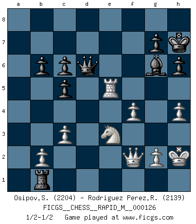 Last move : 1/2-1/2 2022 February 20 6:6:12 [Event "FICGS__CHESS__RAPID_M__000126"] [Site "FICGS"] [Date "2021.12.02"] [Round "1"] [White "Osipov,Sergey"] [Black "Rodriguez Perez,Rene"] [Result "1/2-1/2"] [WhiteElo "2204"] [BlackElo "2139"] 1.e4 e5 2.Nf3 Nc6 3.Bb5 f5 4.d3 fxe4 5.dxe4 Nf6 6.O-O Bc5 7.Bxc6 bxc6 8.Nxe5 O-O 9.Nc3 d6 10.Na4 Qe8 11.Nd3 Bg4 12.Qe1 Bd4 13.c3 Bb6 14.Nf4 Bc8 15.Nxb6 axb6 16.f3 Ba6 17.Rf2 Bc4 18.a4 Bb3 19.Ne2 c5 20.Bg5 Nd7 21.Bh4 Bxa4 22.Bg3 Bb3 23.Rxa8 Qxa8 24.h3 Qa2 25.Qd2 Bf7 26.Rf1 Ra8 27.Re1 h6 28.Nc1 Qc4 29.Nd3 Qb5 30.Kh2 Bc4 31.Nf2 Ra2 32.Nd1 Kh7 33.e5 Nxe5 34.Bxe5 dxe5 35.Rxe5 Qc6 36.Ne3 Bf7 37.f4 Qd6 38.Qc2+ Bg6 39.Qe2 Bf7 40.Ng4 Ra1 41.Ne3 Rc1 42.Qf2 Rb1 43.Qc2+ Bg6 44.Qf2 c6 45.h4 Bf7 46.Qc2+ Bg6 47.Qf2 Bf7 48.Qc2+ Bg6 49.Qf2 1/2-1/2 Ruy Lopez : Schliemann defense Kingside Castling by player White (move 6) Kingside Castling by player Black (move 8) This chess game ended in a draw. Follow this game move after move (download)Suddenly it was obvious to me in my analysis I had missed what Fischer had found with the greatest of ease at the board. (Mikhail Botvinnik) Intelligenz läßt sich nicht am Weg, sondern nur am Ergebnis feststellen. (Garry Kasparov) Si tu oponente no puede hacer nada activo, entonces no apures la posición; En vez de eso, dejalo estar sentado ahí, sufriendo y rogandote por un empate. (Jeremy Silman) Dieu déplace le joueur, et celui-ci la pièce. Quel Dieu derrière Dieu commence donc la trame ? Arturo Perez-Reverte (prix de littérature policière 1993). There is no instance of a country having benefited from prolonged warfare. (Sun Tzu)