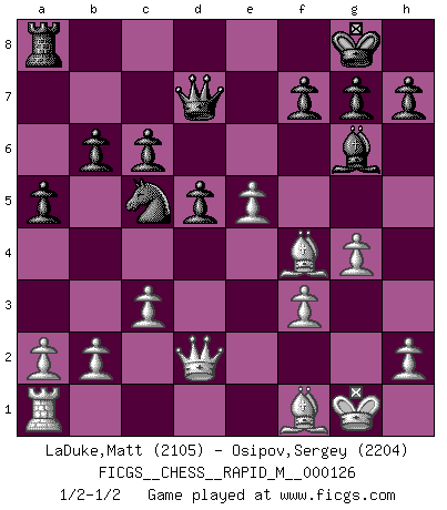 Last move : 1/2-1/2 2021 December 24 14:25:7 [Event "FICGS__CHESS__RAPID_M__000126"] [Site "FICGS"] [Date "2021.12.02"] [Round "1"] [White "LaDuke,Matt"] [Black "Osipov,Sergey"] [Result "1/2-1/2"] [WhiteElo "2105"] [BlackElo "2204"] 1.e4 e5 2.Nf3 Nc6 3.Bb5 Nf6 4.O-O Nxe4 5.Re1 Nd6 6.Nxe5 Be7 7.Bf1 Nxe5 8.Rxe5 O-O 9.d4 Bf6 10.Re1 Re8 11.Bf4 Rxe1 12.Qxe1 Ne8 13.c3 d5 14.Nd2 c6 15.Nb3 Bf5 16.Nc5 b6 17.Nd3 Nd6 18.Qd1 Qd7 19.Ne5 Bxe5 20.dxe5 Ne4 21.f3 Nc5 22.g4 Bg6 23.Qd2 a5 1/2-1/2 Ruy Lopez : Berlin defense, Open variation Kingside Castling by player White (move 4) Kingside Castling by player Black (move 8) This chess game ended in a draw. Follow this game move after move (download)Every Chess master was once a beginner. (Chernev) Mein erstes Ziel war nicht, die Partie zu gewinnen, sondern eine Figur zu opfern. -- der junge (Wilhelm Steinitz) Fischer era un maestro de claridad y un Rey del posicionamiento astuto. Sus oponentes podían ver hacia donde se dirigía pero eran impotentes para detenerlo. (Bruce Pandolfini) Votre seul travail dans les ouvertures est d'obtenir un milieu de partie jouable. (Lajos Portish) Mac users swear by their computers. PC users swear at their computers. (Author unknown)