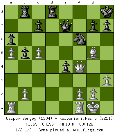Last move : 1/2-1/2 2022 January 9 22:21:42 [Event "FICGS__CHESS__RAPID_M__000126"] [Site "FICGS"] [Date "2021.12.02"] [Round "1"] [White "Osipov,Sergey"] [Black "Koivuniemi,Raimo"] [Result "1/2-1/2"] [WhiteElo "2204"] [BlackElo "2221"] 1.e4 e5 2.Nf3 Nc6 3.Bb5 a6 4.Ba4 Nf6 5.O-O b5 6.Bb3 Bc5 7.a4 Rb8 8.c3 d6 9.d4 Bb6 10.a5 Ba7 11.h3 O-O 12.Be3 exd4 13.cxd4 Nb4 14.Nc3 Bb7 15.Ng5 Qe7 16.e5 dxe5 17.Nxf7 e4 18.Ng5 Kh8 19.Ne6 Rfc8 20.Qd2 Bd5 21.Bxd5 Nbxd5 22.Nxd5 Nxd5 23.Nc5 Bxc5 24.dxc5 Rd8 25.Bg5 Nf6 26.Qf4 1/2-1/2 Ruy Lopez : 5.O-O Kingside Castling by player White (move 5) Kingside Castling by player Black (move 11) This chess game ended in a draw. Follow this game move after move (download)Nonsense was the last thing Fischer was interested in, as far as Chess was concerned. (Elie Agur) Dein Körper muss in Topform sein. Dein Schach verfällt, wenn dein Körper verfällt. Der Körper kann nicht vom Geist getrennt werden. (Robert James Fischer) Tu no necesitas jugar muy bien, únicamente ayudar a tu oponenet a que juegue muy mal. (Genrikh Chepukaitis) C'est la seule position que je connaisse où les deux camps sont mals. Propos prêtés à V. Anand. 'preceded by its own quotation yields a falsehood' preceded by its own quotation yields a falsehood. (W. V. O. Quine - Set Theory And Its Logic, 1953)