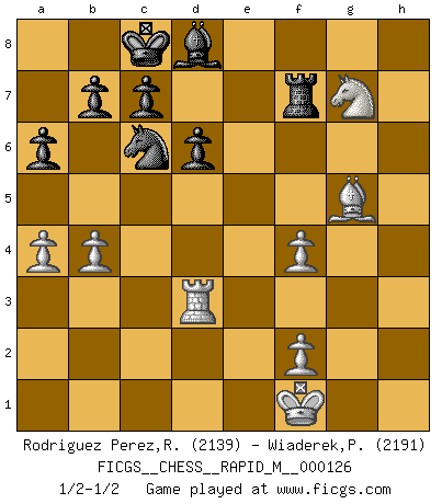 Last move : 1/2-1/2 2022 March 19 10:20:12 [Event "FICGS__CHESS__RAPID_M__000126"] [Site "FICGS"] [Date "2021.12.02"] [Round "1"] [White "Rodriguez Perez,Rene"] [Black "Wiaderek,Piotr"] [Result "1/2-1/2"] [WhiteElo "2139"] [BlackElo "2191"] 1.e4 e5 2.Nf3 Nc6 3.Bc4 Nf6 4.d3 Bc5 5.c3 a6 6.O-O d6 7.a4 O-O 8.Bg5 h6 9.Bh4 g5 10.Bg3 Ba7 11.Nbd2 Kg7 12.Re1 Nh7 13.d4 h5 14.h3 g4 15.Bh4 f6 16.hxg4 hxg4 17.Nh2 Qe8 18.Be2 Qh5 19.Bg3 Ng5 20.Bxg4 Bxg4 21.Qxg4 Qxg4 22.Nxg4 exd4 23.Nf3 Nxf3+ 24.gxf3 Rae8 25.Rec1 f5 26.exf5 Rxf5 27.Kg2 Bb6 28.Rab1 Ra5 29.b3 dxc3 30.Rxc3 Bd4 31.Rd3 Rh8 32.Re1 Bf6 33.Re4 Bd8 34.Bf4 Rf5 35.Bd2 Rh7 36.Bc3+ Kf8 37.Ne3 Rfh5 38.Ng4 Rf5 39.Ne3 R5f7 40.Nd5 Rh6 41.b4 Ne7 42.Bd2 Rh5 43.Nf4 Rg5+ 44.Kf1 Ke8 45.Ne6 Rgf5 46.Bg5 Kd7 47.f4 Nc6 48.Nc5+ Kc8 49.Re8 Rf8 50.Rxf8 Rxf8 51.Ne6 Rf5 52.Ng7 Rf7 53.Ne6 Rf5 54.Ng7 Rf7 1/2-1/2 Two knights defense (Modern Bishop's Opening) Kingside Castling by player White (move 6) Kingside Castling by player Black (move 7) This chess game ended in a draw. Follow this game move after move (download)You sit at the board and suddenly your heart leaps. Your hand trembles to pick up the piece and move it. But what Chess teaches you is that you must sit there calmly and think about whether it's really a good idea and whether there are other better ideas. (Stanley Kubrick) Charakterschwächen offenbaren sich normalerweise während einer Schachpartie. (Garry Kasparov) Cuando tu casa esta en llamas, no puedes ser molestado por tus vecinos. O, como decinos en Ajedrez, si tu Rey esta bajo ataque, no te preocupa perder un Peón del lado de la Reina. (Gary Kasparov) Le génie consiste à savoir transgresser les règles au moment opportun. (Teichmann) The various flowers seem good to different people. (Chinese proverb)