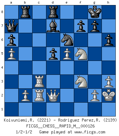 Last move : 1/2-1/2 2022 March 5 17:50:46 [Event "FICGS__CHESS__RAPID_M__000126"] [Site "FICGS"] [Date "2021.12.02"] [Round "1"] [White "Koivuniemi,Raimo"] [Black "Rodriguez Perez,Rene"] [Result "1/2-1/2"] [WhiteElo "2221"] [BlackElo "2139"] 1.e4 e5 2.Nf3 Nc6 3.Bc4 Nf6 4.d3 Bc5 5.c3 d6 6.O-O O-O 7.Re1 a6 8.a4 Ba7 9.h3 b5 10.Bb3 b4 11.a5 Rb8 12.Nbd2 Be6 13.Bc2 h6 14.Nf1 b3 15.Bb1 d5 16.exd5 Qxd5 17.Be3 Bxe3 18.fxe3 Qd6 19.d4 exd4 20.cxd4 Rfd8 21.Qd2 Nb4 22.e4 Nh5 23.d5 Bd7 24.Ra3 c6 25.Ne3 cxd5 26.e5 Qc5 27.Rc1 Nc2 28.Bxc2 bxc2 29.Rxc2 Qa7 30.Kh2 Nf4 31.Rac3 Ne6 32.Nf5 1/2-1/2 Two knights defense (Modern Bishop's Opening) Kingside Castling by player White (move 6) Kingside Castling by player Black (move 6) This chess game ended in a draw. Follow this game move after move (download)I know people who have all the will in the world, but still can't play good Chess. (Bobby Fischer) Die Elozahlen sind sehr schlecht für das Schach. Jetzt ist Schach eine Sportindustrie, die darauf zielt Elopunkte zu machen. (Miguel Najdorf) Bendita sea la memoria de aquel que dio al mundo este juego inmortal. (A. G. Gardiner) On n'a jamais que l'âge auquel on a commence à jouer aux échecs car après on cesse de vieillir. (Capablanca) Are you threatening me, Master Jedi ? (Chancellor Palpatine in Star Wars ep.3)