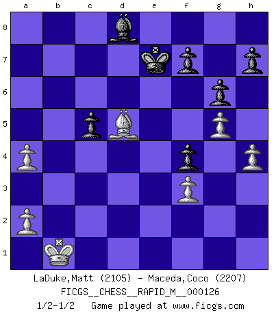 Last move : 1/2-1/2 2022 February 10 2:2:28 [Event "FICGS__CHESS__RAPID_M__000126"] [Site "FICGS"] [Date "2021.12.02"] [Round "1"] [White "LaDuke,Matt"] [Black "Maceda,Coco"] [Result "1/2-1/2"] [WhiteElo "2105"] [BlackElo "2207"] 1.e4 c5 2.Nf3 d6 3.d4 cxd4 4.Nxd4 Nf6 5.Nc3 a6 6.f3 e5 7.Nb3 Be6 8.Be3 Be7 9.Qd2 O-O 10.O-O-O Nbd7 11.g4 b5 12.g5 Nh5 13.Kb1 Nb6 14.Na5 Rc8 15.Nd5 Nxd5 16.exd5 Bxd5 17.Qxd5 Qxa5 18.c4 Nf4 19.Bxf4 exf4 20.h4 Qa4 21.Rc1 Rfe8 22.Bd3 Rc5 23.Qe4 g6 24.cxb5 axb5 25.Qxa4 bxa4 26.Rxc5 dxc5 27.Re1 Rd8 28.Bc2 Kf8 29.Re4 a3 30.bxa3 Rd4 31.a4 Rxe4 32.Bxe4 Bd8 33.Bd5 Ke7 1/2-1/2 Sicilian : Najdorf Kingside Castling by player Black (move 9) Queenside Castling by player White (move 10) This chess game ended in a draw. Follow this game move after move (download)Chess is a sea in which a gnat may drink and an elephant may bathe. (Hindu proverb) Über Frauen: Chess is better. (Robert James Fischer) Un entendimiento minucioso de las típicas continuaciones de mate hacen de las mas complicadas combinaciones de sacrificio que conducen hacia ellas no solo no dificiles, sino casi un asunto de rutina. (Siegbert Tarrasch) Il (Jacob Murray) ne joue pas pour le bon coup, mais pour le meilleur. (Eloi Relange) No, I am still playing. (Anatoly Karpov)