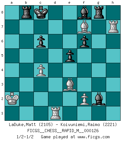 Last move : 1/2-1/2 2022 February 2 3:52:33 [Event "FICGS__CHESS__RAPID_M__000126"] [Site "FICGS"] [Date "2021.12.02"] [Round "1"] [White "LaDuke,Matt"] [Black "Koivuniemi,Raimo"] [Result "1/2-1/2"] [WhiteElo "2105"] [BlackElo "2221"] 1.e4 c5 2.Nf3 Nc6 3.Nc3 e6 4.d4 cxd4 5.Nxd4 a6 6.Be2 Qc7 7.Nxc6 bxc6 8.Qd3 Nf6 9.Qg3 Qxg3 10.hxg3 d5 11.g4 Nxe4 12.Nxe4 dxe4 13.Be3 e5 14.O-O-O a5 15.Rh5 f6 16.g5 Be6 17.gxf6 gxf6 18.Rh4 Bxa2 19.Rxe4 a4 20.Rh4 Bd5 21.c4 Bxg2 22.Rg1 Rg8 23.Rxh7 a3 24.Bh5+ Kd8 25.Rd1+ Kc8 26.Bf7 axb2+ 27.Kxb2 Rb8+ 28.Ka2 1/2-1/2 Sicilian defense Queenside Castling by player White (move 14) This chess game ended in a draw. Follow this game move after move (download)If you aren't afraid of Spassky, then I have removed the element of money. (Jim Slater) Wenn Du einsam bist, wenn Du Dich in der Welt wie ein Fremder fühlst, spiele Schach. Das wird Deinen Geist erheben und Dein Ratgeber im Kampf sein. (Aristoteles) Todo lo que importa ante el tablero de Ajedrez son buenas jugadas. (Bobby Fischer) Les échecs sont plus proches de l'art de l'assassinat que de l'art de la guerre. (Arturo Perez-Reverte) Either move or be moved. (Ezra Pound)