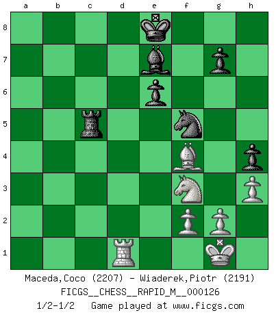 Last move : 1/2-1/2 2022 January 23 5:15:8 [Event "FICGS__CHESS__RAPID_M__000126"] [Site "FICGS"] [Date "2021.12.02"] [Round "1"] [White "Maceda,Coco"] [Black "Wiaderek,Piotr"] [Result "1/2-1/2"] [WhiteElo "2207"] [BlackElo "2191"] 1.e4 e5 2.Nf3 Nc6 3.Bb5 Nf6 4.O-O Nxe4 5.d4 Nd6 6.Bxc6 dxc6 7.dxe5 Nf5 8.Qxd8+ Kxd8 9.Nc3 Be7 10.Rd1+ Ke8 11.h3 h5 12.Bg5 Be6 13.Rd2 Rd8 14.Rxd8+ Kxd8 15.Rd1+ Ke8 16.b3 h4 17.Ne2 Bd5 18.Bc1 a5 19.Ne1 a4 20.c4 Be6 21.Nf3 b5 22.Nf4 Rh6 23.Nxe6 Rxe6 24.bxa4 b4 25.a3 c5 26.axb4 Ra6 27.bxc5 Rxa4 28.e6 fxe6 29.Bf4 Rxc4 30.Bxc7 Rxc5 31.Bf4 1/2-1/2 Ruy Lopez : Berlin defense, Open variation Kingside Castling by player White (move 4) This chess game ended in a draw. Follow this game move after move (download)A passed Pawn increases in strength as the number of pieces on the board diminishes. (Capablanca) Im Schach gibt es keinen Platz für Galanterie. (Irving Chernev) Aquellos que dicen entender al Ajedrez, no entienden nada. (Robert Hubner) La menace est plus forte que l'exécution. (Aaron Nimzovitch) If only faces could talk... (Pat Summerall, Sportscaster during the Super Bowl)