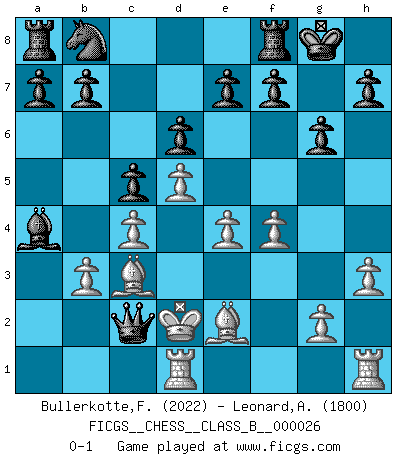 Last move : 0-1 2007 November 22 19:33:14 [Event "FICGS__CHESS__CLASS_B__000026"] [Site "FICGS"] [Date "2007.07.25"] [Round "1"] [White "Bullerkotte,Frank"] [Black "Leonard,Andrew"] [Result "0-1"] [WhiteElo "2022"] [BlackElo "1800"] 1.d4 Nf6 2.c4 g6 3.Nc3 c5 4.d5 Bg7 5.e4 d6 6.Nf3 O-O 7.h3 Qa5 8.Bd2 Nfd7 9.Qc2 Ne5 10.Nxe5 Bxe5 11.f4 Bf6 12.O-O-O Bxc3 13.Bxc3 Qxa2 14.Be2 Bd7 15.Kd2 Ba4 16.b3 Qxc2+ 0-1 This chess game has been lost on time (started : 2007.07.25 0:43:9) King's Indian defense, 3.Nc3 Kingside Castling by player Black (move 6) Queenside Castling by player White (move 12) Player Black won this chess game. Follow this game move after move (download)Without error there can be no brilliancy. (Emanuel Lasker) Ohne Fehler kann es keine Brillanz geben. (Emanuel Lasker) Personalmente, yo prefiero mirar hacia el futuro en donde un programa de computadora gane el título mundial de Ajedrez. La humanidad necesita una lección de humildad. (Richard Dawkings) Mais l'homme est une créature légère et illogique : semblable au joueur d'échecs, il n'aime que le processus du but à atteindre, non le but lui-même. (Dostoïevsky) No enterprise is more likely to succeed than one concealed from the enemy until it is ripe for execution. (Niccolo Machiavelli)