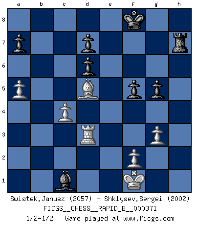Last move : 1/2-1/2 2022 February 19 14:12:18 [Event "FICGS__CHESS__RAPID_B__000371"] [Site "FICGS"] [Date "2021.12.04"] [Round "1"] [White "Swiatek,Janusz"] [Black "Shklyaev,Sergei"] [Result "1/2-1/2"] [WhiteElo "2057"] [BlackElo "2002"] 1.e4 e5 2.Nf3 Nc6 3.Bb5 Nf6 4.O-O Nxe4 5.Re1 Nd6 6.Nxe5 Be7 7.Bf1 Nxe5 8.Rxe5 O-O 9.d4 Bf6 10.Re1 Re8 11.Bf4 Rxe1 12.Qxe1 Bxd4 13.Bxd6 cxd6 14.Nc3 Be5 15.g3 b6 16.Bg2 Rb8 17.Rb1 Ba6 18.Nd5 Rc8 19.Qd2 Bc4 20.b3 Bxd5 21.Bxd5 Qf6 22.Rd1 h5 23.c4 h4 24.Qe2 Re8 25.Kg2 Kf8 26.Qg4 hxg3 27.hxg3 Re7 28.Rd3 Qh6 29.b4 Bb2 30.Qd1 g6 31.Qf3 f5 32.Qd1 Rh7 33.Kf1 Qc1 34.Qxc1 Bxc1 35.a4 g5 36.a5 bxa5 37.bxa5 1/2-1/2 Ruy Lopez : Berlin defense, Open variation Kingside Castling by player White (move 4) Kingside Castling by player Black (move 8) This chess game ended in a draw. Follow this game move after move (download)I am still a victim of Chess. It has all the beauty of art and much more. It cannot be commercialized. Chess is much purer than art in its social position. (Marcel Duchamp) Ich verachte Kasparow. (Viktor Kortschnoi) Con o sin el título, Bobby Fischer fue sin lugar a dudas el mas grande jugador de su época. (Burt Hochberg) Mon pion favori sur ma case favorite ! Bronstein en parlant d'un coup de pion en h5 quand il avait les Noirs. Ah, the Socrating method. The best way we have of teaching everything-apart from juggling chainsaws. (Gregory House, House M.D.)