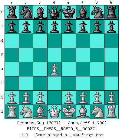 Last move : 1-0 2022 January 4 14:2:30 [Event "FICGS__CHESS__RAPID_B__000371"] [Site "FICGS"] [Date "2021.12.04"] [Round "1"] [White "Cesbron,Guy"] [Black "Jano,Jeff"] [Result "1-0"] [WhiteElo "2027"] [BlackElo "1700"] 1.d4 1-0 This chess game has been lost on time (started : 2021.12.04 11:24:45) Queen's pawn Player White won this chess game. Follow this game move after move (download)Modern Chess is too much concerned with things like Pawn structure. Forget it, Checkmate ends the game. (Nigel Short) Woher wissen wir, daß der Neanderthaler Blindschach gespielt hat? -- Bei Ausgrabungen wurden keine Schachbretter und Figuren gefunden. (Anonymous) Nunca nadie ha ganado una partida de Ajedrez rindiendose. (Unknown) Le génie consiste à savoir transgresser les règles au moment opportun. (Teichmann) The large trees attract high winds. (Chinese proverb)