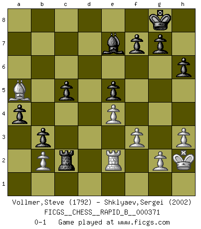 Last move : 0-1 2022 February 26 14:56:42 [Event "FICGS__CHESS__RAPID_B__000371"] [Site "FICGS"] [Date "2021.12.04"] [Round "1"] [White "Vollmer,Steve"] [Black "Shklyaev,Sergei"] [Result "0-1"] [WhiteElo "1792"] [BlackElo "2002"] 1.e4 e5 2.Nf3 Nc6 3.Bb5 a6 4.Ba4 Nf6 5.O-O Be7 6.Re1 b5 7.Bb3 d6 8.c3 O-O 9.d4 Bg4 10.d5 Na5 11.Bc2 c6 12.dxc6 Qb6 13.h3 Be6 14.Be3 Qxc6 15.Nbd2 Rfc8 16.Rc1 h6 17.Bb1 Nc4 18.Nxc4 bxc4 19.Bd2 Qb5 20.Re2 a5 21.a4 Qb3 22.Qxb3 cxb3 23.Bd3 Bc4 24.Ne1 Bxd3 25.Nxd3 Rc4 26.f3 Rxa4 27.c4 Nd7 28.Rc3 Ra1+ 29.Kh2 a4 30.Bc1 Nc5 31.Nxc5 dxc5 32.Be3 Rd8 33.Rc1 Rxc1 34.Bxc1 Rd4 35.Bd2 Rxc4 36.Ba5 Rc2 0-1 Ruy Lopez : Closed Kingside Castling by player White (move 5) Kingside Castling by player Black (move 8) Player Black won this chess game. Follow this game move after move (download)The hallmark of the artist is simplicity. (Larry Evans) Bis zum Jahr 1971 verlief in meiner Schachkariere alles glatt. Dieses dramatische Match [Fischer-Taimanov 6:0] machte mein Leben zur Hölle. (Mark Taimanov) Fischer era un maestro de claridad y un Rey del posicionamiento astuto. Sus oponentes podían ver hacia donde se dirigía pero eran impotentes para detenerlo. (Bruce Pandolfini) Je menace de comprendre la position. (Anonyme) When you stop learning you start dying. (Scott Adams)