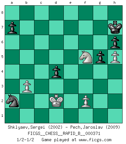 Last move : 1/2-1/2 2022 April 25 8:32:34 [Event "FICGS__CHESS__RAPID_B__000371"] [Site "FICGS"] [Date "2021.12.04"] [Round "1"] [White "Shklyaev,Sergei"] [Black "Pech,Jaroslav"] [Result "1/2-1/2"] [WhiteElo "2002"] [BlackElo "2009"] 1.e4 e6 2.d4 d5 3.Nc3 Nf6 4.Bg5 dxe4 5.Nxe4 Be7 6.Nxf6+ Bxf6 7.Bxf6 Qxf6 8.Nf3 O-O 9.Qd2 c5 10.O-O-O Rd8 11.Bd3 cxd4 12.Ng5 h6 13.Ne4 Qh4 14.g3 Qe7 15.g4 f5 16.Ng3 Nc6 17.gxf5 exf5 18.Rde1 Qf7 19.b3 Kh7 20.Rhg1 g6 21.h4 Qf6 22.Kb1 Bd7 23.Qf4 Rf8 24.Qc7 Rf7 25.Qxb7 Rb8 26.Qc7 Rc8 27.Qf4 Nb4 28.Re5 Rc3 29.h5 g5 30.Bxf5+ Bxf5 31.Qxf5+ Qxf5 32.Rxf5 Rxf5 33.Nxf5 Rxc2 34.Rc1 Rxc1+ 35.Kxc1 Nxa2+ 36.Kd2 1/2-1/2 French : Burn variation Kingside Castling by player Black (move 8) Queenside Castling by player White (move 10) This chess game ended in a draw. Follow this game move after move (download)I look one move ahead... the best ! (Siegbert Tarrasch) Wer sich die Fähigkeit anerziehen will im Schach selbstständig zu denken, der muß alles meiden, was leblos ist: ausgeklügelte Theorien, die sich auf sehr wenige Beispiele und eine Menge Hirngespinste stützen. (Emanuel Lasker) Los asuntos humanos son como una partida de Ajedrez: solo aquellos que no lo toman seriamente, pueden ser llamados buenos jugadores. (Hung Tzu Ch'eng) Nous sommes les pions de la mystérieuse partie d'Echecs jouée par Dieu. Il nous déplace, nous arrête, nous pousse encore, puis nous lance un à un dans la boîte du Néant. Epitaphe sur la tombe de David Janowsky (1868-1927). Mandala - that's it! 16x16 squares as multiple of the four and the eight because of the Four Noble Truths and the Noble Eightfold Path. (Heinz-Georg Lehnhoff about Big Chess)