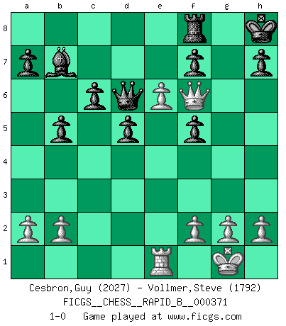 Last move : 1-0 2022 January 30 2:31:34 [Event "FICGS__CHESS__RAPID_B__000371"] [Site "FICGS"] [Date "2021.12.04"] [Round "1"] [White "Cesbron,Guy"] [Black "Vollmer,Steve"] [Result "1-0"] [WhiteElo "2027"] [BlackElo "1792"] 1.d4 d5 2.c4 e6 3.Nc3 Nf6 4.Nf3 c6 5.Bg5 Be7 6.e3 dxc4 7.Bxc4 Nd5 8.Bxe7 Qxe7 9.O-O O-O 10.Rc1 Nd7 11.e4 N5b6 12.Be2 Nf6 13.Qb3 Nbd7 14.Rfd1 b6 15.e5 Ne8 16.Ne4 Bb7 17.Bd3 g6 18.Nc5 Nxc5 19.dxc5 b5 20.Be4 Nc7 21.Rd6 Nd5 22.Bxd5 exd5 23.Re1 Rad8 24.Qe3 Kg7 25.Nd4 Rxd6 26.cxd6 Qd7 27.e6 Qxd6 28.Nf5+ gxf5 29.Qg5+ Kh8 30.Qf6+ 1-0 QGD Semi-Slav Kingside Castling by player White (move 9) Kingside Castling by player Black (move 9) Player White won this chess game. Follow this game move after move (download)What would Chess be without silly mistakes ? (Kurt Richter) Ich würde die 30 stärksten Spieler der USA im Simultanspiel besiegen. (José Raúl Capablanca) Un mal plan es mejor que no tener ningún plan. (Frank Marshall) Le joueur d'Echecs qui veut atteindre le top est obligé de développer son propre credo créatif. Alexeï Stepanovicth Souétine. Il est facile d'écrire des livres ! Ce qui est difficile, c'est de jouer ! (Alexeï Stepanovicth Souétine) Just because you do not take an interest in politics doesn't mean politics won't take an interest in you. (Pericles 430 B.C.)