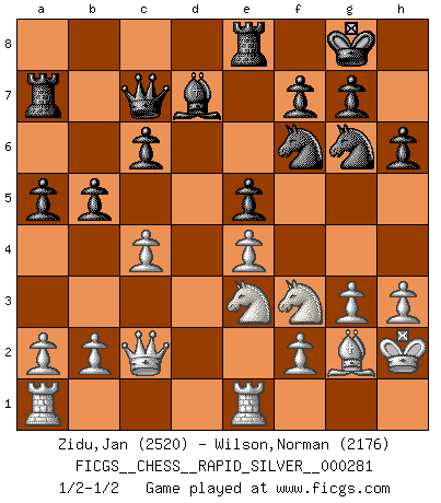 Last move : 1/2-1/2 2022 February 10 15:11:57 [Event "FICGS__CHESS__RAPID_SILVER__000281"] [Site "FICGS"] [Date "2021.12.09"] [Round "2"] [White "Zidu,Jan"] [Black "Wilson,Norman"] [Result "1/2-1/2"] [WhiteElo "2520"] [BlackElo "2176"] 1.e4 e5 2.Nf3 Nc6 3.Bc4 Bc5 4.c3 Nf6 5.d3 a5 6.O-O d6 7.Re1 O-O 8.h3 h6 9.Bb5 Ba7 10.Nbd2 Ne7 11.d4 Ng6 12.Bd3 Nh5 13.Nf1 Qf6 14.Ne3 Nhf4 15.Bf1 Re8 16.Nc4 Bd7 17.Be3 Nf8 18.Kh2 b5 19.Na3 c6 20.g3 N4g6 21.Bg2 Qd8 22.Nc2 Qc7 23.dxe5 dxe5 24.Bxa7 Rxa7 25.Ne3 Nh7 26.Qc2 Nf6 27.c4 1/2-1/2 Giuoco Piano Kingside Castling by player White (move 6) Kingside Castling by player Black (move 7) This chess game ended in a draw. Follow this game move after move (download)I prefer to lose a really good game than to win a bad one. (David Levy) Die Partien sind immer verschieden, die Interviews immer die gleichen. (Garry Kasparov) El hombre es un frívolo, una creatura engañosa y como un jugador de Ajedrez, se preocupa mas por el proceso de obtener su meta que de la meta por sí misma. (Dostoyevsky) Si je n'étais pas joueur d'échecs, je serais le meilleur dans quelque chose d'autre. (Anatoli Karpov) To send light into the darkness of men's hearts - such is the duty of the artist. (Schumann)