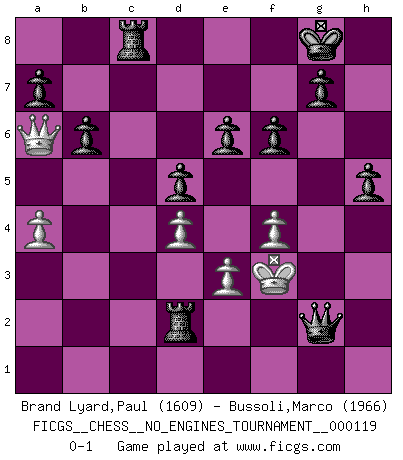 Last move : 0-1 2021 December 13 9:51:2 [Event "FICGS__CHESS__NO_ENGINES_TOURNAMENT__000119"] [Site "FICGS"] [Date "2021.12.09"] [Round "1"] [White "Brand Lyard,Paul"] [Black "Bussoli,Marco"] [Result "0-1"] [WhiteElo "1609"] [BlackElo "1966"] 1.f4 d5 2.d4 Bf5 3.e3 Nf6 4.Nf3 e6 5.Bd3 Ne4 6.Bxe4 Bxe4 7.Nc3 Bb4 8.a3 Bxc3+ 9.bxc3 Nd7 10.O-O O-O 11.Rb1 h6 12.Rxb7 Nb6 13.Rxb6 cxb6 14.Ne5 Rc8 15.Bd2 Qe7 16.c4 f6 17.Ng6 Bxg6 18.a4 Rxc4 19.Qa1 Rxc2 20.Rd1 Bh5 21.Qb1 Bxd1 22.Qxd1 Rfc8 23.Qe2 Qa3 24.Qa6 Qa1+ 25.Kf2 Rxd2+ 26.Kg3 Qe1+ 27.Kf3 Qf2+ 28.Kg4 Qxg2+ 29.Kh4 Qxh2+ 30.Kg4 h5+ 31.Kf3 Qg2+ 0-1 Bird's Opening Kingside Castling by player White (move 10) Kingside Castling by player Black (move 10) Player Black won this chess game. Follow this game move after move (download)All Chess players should have a hobby. (Savielly Tartakower) Wenn ich gewinne bin ich ein Genie. Wenn nicht, dann bin ich keines. (Robert James Fischer) En un gambito tu regalas un Peón por el bién de tomar un juego perdido. (Samuel Standige Boden) Le thème de l'attaque double intervient d'une manière ou d'une autre dans l'immense majorité des combinaisons. (Youri Averbakh) Quotation,n.: The act of repeating erroneously the words of another. The words erroneously repeated. (Ambrose Bierce, The Devil's Dictionary)