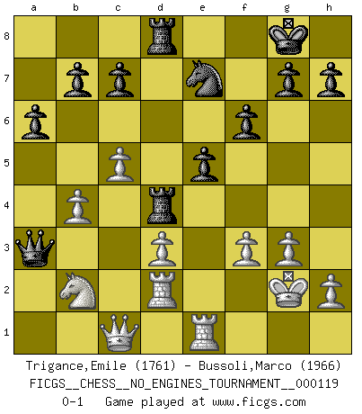 Last move : 0-1 2022 January 31 17:11:24 [Event "FICGS__CHESS__NO_ENGINES_TOURNAMENT__000119"] [Site "FICGS"] [Date "2021.12.09"] [Round "1"] [White "Trigance,Emile"] [Black "Bussoli,Marco"] [Result "0-1"] [WhiteElo "1761"] [BlackElo "1966"] 1.Nf3 d5 2.c4 d4 3.e3 Nc6 4.exd4 Nxd4 5.Nxd4 Qxd4 6.Nc3 Nf6 7.d3 e5 8.Be2 Bb4 9.Bd2 O-O 10.a3 Bc5 11.Be3 Qd6 12.Nb5 Qb6 13.Bxc5 Qxc5 14.b4 Qb6 15.O-O a6 16.Nc3 Bf5 17.Re1 Rad8 18.Qc2 Rd4 19.Na4 Qd6 20.c5 Qe6 21.Rad1 Rfd8 22.Nb2 Nd5 23.g3 Qg6 24.Kh1 Bh3 25.Bf3 Qf6 26.Bg2 Qc6 27.f3 Bxg2+ 28.Kxg2 f6 29.Qb3 Qe6 30.Qc2 Ne7 31.Rd2 Qa2 32.Qc1 Qxa3 0-1 Reti : Advance variation Kingside Castling by player Black (move 9) Kingside Castling by player White (move 15) Player Black won this chess game. Follow this game move after move (download)I love all positions. Give me a difficult positional game, I will play it. But totally won positions, I cannot stand them. (Hein Donner) Der Umstand, daß uns eine 7 Stunden Zeitkontrolle ermöglicht eine großartige, tiefe Partie zu spielen, ist für die Massenmedien nicht weiter von Bedeutung. (Alexej Shirov) Un mal día en el Ajedrez, es mejor que cualquier buen día en el trabajo. (Anonymous) D'abord les bases : Jouez et étudiez, puis étudiez et jouez, ensuite jouez et étudiez, puis étudiez et jouez. Deuxièmement : Donnez toujours le meilleur de vous-même ! (Ken Smith) After growing wildly for years, the field of computing appears to be reaching its infancy. (John Pierce)