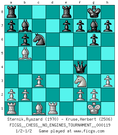 Last move : 1/2-1/2 2021 December 24 16:31:21 [Event "FICGS__CHESS__NO_ENGINES_TOURNAMENT__000119"] [Site "FICGS"] [Date "2021.12.09"] [Round "1"] [White "Sternik,Ryszard"] [Black "Kruse,Herbert"] [Result "1/2-1/2"] [WhiteElo "1970"] [BlackElo "2506"] 1.e4 c5 2.Nf3 d6 3.d4 cxd4 4.Qxd4 Nc6 5.Qe3 Nf6 6.Nc3 g6 7.h3 Bg7 8.Be2 O-O 9.O-O b6 10.Rd1 Bb7 11.e5 Ne8 12.exd6 Nxd6 13.Nb5 Re8 14.Qf4 Qb8 15.c3 Nxb5 16.Bxb5 Qxf4 1/2-1/2 Sicilian, Chekhover variation Kingside Castling by player Black (move 8) Kingside Castling by player White (move 9) This chess game ended in a draw. Follow this game move after move (download)Methodical thinking is of more use in Chess than inspiration. (C. J. S. Purdy) Schon mancher Spieler hat aufgegeben, um zu vermeiden, daß er eine Figur verliert. (Savielly Grigorievitsch Tartakower) Con el fin de mejorar tu juego, debes de estudiar los finales antes que todo, ya que mientras que los finales pueden ser estudiados y dominados por sí mismos, el juegomedio y la apertura deben de ser estudiados en relación con los finales. (José Raúl Capablanca) Un journaliste : 'Vous préférez avoir une dame de plus sur l'échiquier ou au lit ?' Boris Spassky : 'Ca dépend de la position.' To steal ideas from one person is plagiarism. To steal from many is research. (Unknown)
