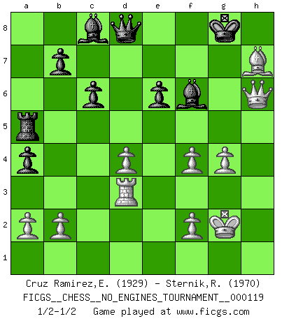 Last move : 1/2-1/2 2022 January 18 10:6:23 [Event "FICGS__CHESS__NO_ENGINES_TOURNAMENT__000119"] [Site "FICGS"] [Date "2021.12.09"] [Round "1"] [White "Cruz Ramirez,Eliecer"] [Black "Sternik,Ryszard"] [Result "1/2-1/2"] [WhiteElo "1929"] [BlackElo "1970"] 1.d4 Nf6 2.c4 e6 3.Nf3 d5 4.Nc3 Be7 5.Bf4 dxc4 6.e3 Nd5 7.Bxc4 Nxf4 8.exf4 O-O 9.O-O Qd6 10.g3 c6 11.Qc2 Nd7 12.Rfe1 Nb6 13.Ne4 Qc7 14.Bf1 Nd5 15.Rac1 Nf6 16.Red1 Nxe4 17.Qxe4 Qb6 18.Rb1 a5 19.Ne5 a4 20.h4 g6 21.h5 Kg7 22.Bd3 Rd8 23.hxg6 hxg6 24.Nxf7 Kxf7 25.Qxg6+ Kf8 26.Be4 Rd6 27.Kg2 Ra5 28.Rd3 Qd8 29.Rh1 Bf6 30.Rh7 Rd7 31.Qh6+ Kg8 32.g4 Rxh7 33.Bxh7+ 1/2-1/2 Queen's pawn game Kingside Castling by player Black (move 8) Kingside Castling by player White (move 9) This chess game ended in a draw. Follow this game move after move (download)It is difficult to play against Einstein's theory --on his first loss to Fischer. (Mikhail Tal) Es ist nicht das erste mal, dass sich die FIDE dem Arabischen Geld gebeugt hat (über die FIDE WM 2004 in Lybien). (Larry Evans) Cuando no sepas que mover, espera por una idea que se le venga a la la cabeza de tu oponente. Tenlo por seguro de que esa idea estará incorrecta. (Siegbert Tarrasch) Les sacrifices démontrent seulement que quelqu'un a gaffé. (Savielly Tartacover) It's unlucky to be superstitious. (Dave Enteles)