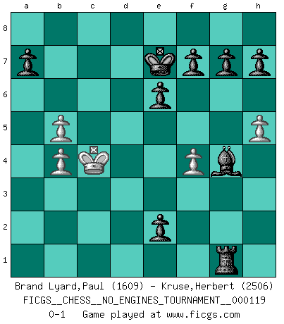 Last move : 0-1 2021 December 12 16:20:27 [Event "FICGS__CHESS__NO_ENGINES_TOURNAMENT__000119"] [Site "FICGS"] [Date "2021.12.09"] [Round "1"] [White "Brand Lyard,Paul"] [Black "Kruse,Herbert"] [Result "0-1"] [WhiteElo "1609"] [BlackElo "2506"] 1.e4 c5 2.d4 cxd4 3.Qxd4 Nc6 4.Qd1 Nf6 5.f3 e6 6.Bg5 Qa5+ 7.Qd2 Bb4 8.c3 Be7 9.Bxf6 Bxf6 10.b4 Nxb4 11.cxb4 Qe5 12.Nc3 Qxc3 13.Rc1 Qxd2+ 14.Kxd2 Bg5+ 15.Kd1 Bxc1 16.Kxc1 b6 17.h4 Bb7 18.Bc4 Rc8 19.Kb2 Rxc4 20.a3 Ke7 21.Ne2 Rhc8 22.Rc1 d5 23.Rxc4 Rxc4 24.g4 dxe4 25.f4 e3 26.Kb3 b5 27.h5 Bf3 28.Ng1 Bxg4 29.a4 Rc1 30.axb5 Rxg1 31.Kc4 e2 0-1 Sicilian : Smith-Morra gambit Player Black won this chess game. Follow this game move after move (download)Later, I began to succeed in decisive games. Perhaps because I realized a very simple truth: not only was I worried, but also my opponent. (Mikhail Tal) Stil? Ich habe keinen Stil! (Anatoly Karpov) El Ajedrez tiene tanto misterio como las mujeres. (Purdy) Si rien de grave n'est détecté lors de l'analyse d'une position, on joue alors le coup. Seconde règle de Blumenfeld. Have no fear of perfection - you'll never reach it. (Salvador Dali)