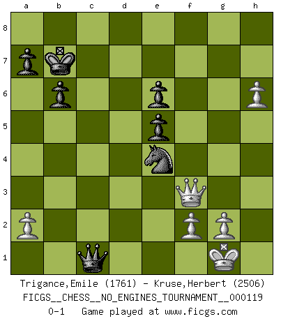 Last move : 0-1 2022 January 31 17:51:39 [Event "FICGS__CHESS__NO_ENGINES_TOURNAMENT__000119"] [Site "FICGS"] [Date "2021.12.09"] [Round "1"] [White "Trigance,Emile"] [Black "Kruse,Herbert"] [Result "0-1"] [WhiteElo "1761"] [BlackElo "2506"] 1.Nf3 Nf6 2.c4 c5 3.d4 cxd4 4.Nxd4 e5 5.Nb5 d5 6.cxd5 Bc5 7.N5c3 O-O 8.e3 Qe7 9.Na4 Bb4+ 10.Nac3 Rd8 11.Bc4 Qc5 12.Qe2 Nxd5 13.O-O Nxc3 14.Nxc3 Bxc3 15.bxc3 Bf5 16.e4 Be6 17.Bxe6 fxe6 18.Qg4 Re8 19.Be3 Qc7 20.Bh6 Kh8 21.Be3 Nd7 22.Bg5 h6 23.Bh4 g5 24.Bxg5 hxg5 25.Qh5+ Kg7 26.Qxg5+ Kf7 27.Qh5+ Ke7 28.Qh7+ Kd8 29.Rad1 Kc8 30.c4 Nc5 31.Qh4 b6 32.Rd2 Rd8 33.Rfd1 Rxd2 34.Rxd2 Kb7 35.Qg4 Rd8 36.Rxd8 Qxd8 37.h4 Qd4 38.h5 Nxe4 39.Qf3 Qxc4 40.h6 Qc1+ 0-1 Reti Opening Kingside Castling by player Black (move 7) Kingside Castling by player White (move 13) Player Black won this chess game. Follow this game move after move (download)All I want to do, ever, is just play Chess. (Bobby Fischer) Ich habe die Schachforschung dermaßen betrieben, dass sie auf eine wissenschaftliche Basis gestellt wurde. (Mikhail Moiseyevich Botvinik) El ganador de una partida es aquel jugador que hace el penúltimo error. (Savielly Tartakover) La menace est plus forte que l'exécution. (Aaron Nimzovitch) There is a computer disease that anybody who works with computers knows about. It's a very serious disease and it interferes completely with the work. The trouble with computers is that you 'play' with them ! (Richard P. Feynman)