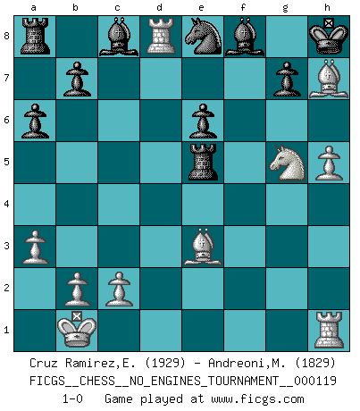 Last move : 1-0 2022 January 17 19:46:36 [Event "FICGS__CHESS__NO_ENGINES_TOURNAMENT__000119"] [Site "FICGS"] [Date "2021.12.09"] [Round "1"] [White "Cruz Ramirez,Eliecer"] [Black "Andreoni,Mario"] [Result "1-0"] [WhiteElo "1929"] [BlackElo "1829"] 1.e4 c5 2.Nc3 a6 3.Nf3 e6 4.d4 cxd4 5.Nxd4 Qc7 6.Qf3 Qe5 7.Be3 Bb4 8.Nde2 Nf6 9.O-O-O Nc6 10.g4 O-O 11.g5 Ne8 12.Kb1 Qa5 13.Qg3 f6 14.gxf6 Rxf6 15.h4 Ne5 16.a3 Bf8 17.Nd4 Nf7 18.h5 Qc7 19.f4 Nh6 20.e5 Rf7 21.Ne4 d6 22.Ng5 dxe5 23.fxe5 Nf5 24.Nxf5 Rxf5 25.Bd3 Qxe5 26.Qxe5 Rxe5 27.Bxh7+ Kh8 28.Rd8 1-0 Sicilian : Closed Queenside Castling by player White (move 9) Kingside Castling by player Black (move 10) Player White won this chess game. Follow this game move after move (download)We must make sure that Chess will not be like a dead language, very interesting, but for a very small group. (Sytze Faber) Früher wurde jeder komplizierte Zug, jedes interessante Opfer mit großem Beifall und Enthusiasmus aufgenommen. Heute schaltet man einfach seinen Fritz an, und man kann sehen, was los ist, ob der Zug geht oder nicht. (Vladimir Kramnik) El muchacho (en ese entonces un niño de 12 años llamado Anatoly Karpov) no tiene ni idea de lo que es el Ajedrez y no hay futuro en absoluto para el en esta profesión. (Mikhail Botvinnik) Plusieurs personnes se sont demandées comment Tal faisait pour gagner... En fait, c'est très simple ! Il met ses pièces au centre de l'échiquier et les sacrifie quelque part ! (David Bronstein) Internal peace cannot coexist with external war. (Don Groves)