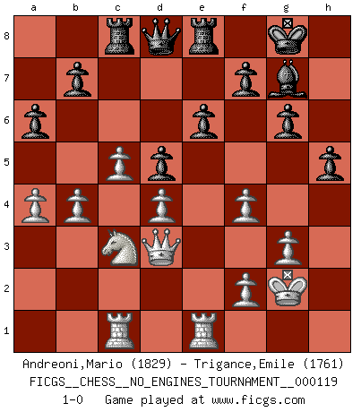 Last move : 1-0 2022 February 7 17:23:4 [Event "FICGS__CHESS__NO_ENGINES_TOURNAMENT__000119"] [Site "FICGS"] [Date "2021.12.09"] [Round "1"] [White "Andreoni,Mario"] [Black "Trigance,Emile"] [Result "1-0"] [WhiteElo "1829"] [BlackElo "1761"] 1.e4 d5 2.exd5 Nf6 3.d4 Nxd5 4.c3 g6 5.Nf3 Bg7 6.Be2 O-O 7.O-O Nd7 8.c4 N5b6 9.c5 Nd5 10.Bc4 c6 11.Bxd5 cxd5 12.Nc3 Nf6 13.Re1 Bg4 14.Bf4 Nh5 15.Bg3 Nxg3 16.hxg3 e6 17.Qd2 Bxf3 18.gxf3 a6 19.b4 Qd7 20.f4 Rac8 21.Kg2 Rfe8 22.Rac1 h5 23.Qd3 Qd8 24.a4 1-0 Scandinavian : Marshall variation Kingside Castling by player Black (move 6) Kingside Castling by player White (move 7) Player White won this chess game. Follow this game move after move (download)You can only get good at Chess if you love the game. (Bobby Fischer) Computer sind die einzigen Gegner, die nicht immer eine Ausrede auf Lager haben, wenn sie gegen mich verlieren. (Robert James Fischer) El Ajedrez es imaginación. (David Bronstein) Echiquier : carré parfait, comme la Jérusalem nouvelle décrite par l'auteur de l'Apocalypse, huit cases sur huit, exaltation du chiffre 4, symbole du cosmos aux quatre horizons... où le noir et le blanc, l'ombre et la lumière, le mal et le bien s'entremêlent et se conjuguent. (Robert Couffignal, Le Gambit du poète) 'preceded by its own quotation yields a falsehood' preceded by its own quotation yields a falsehood. (W. V. O. Quine - Set Theory And Its Logic, 1953)