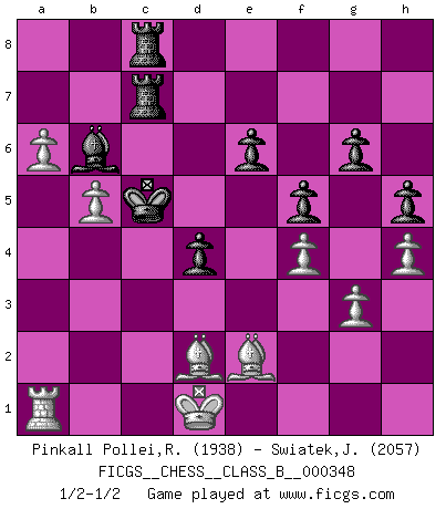 Last move : 1/2-1/2 2022 April 9 15:9:2 [Event "FICGS__CHESS__CLASS_B__000348"] [Site "FICGS"] [Date "2021.12.14"] [Round "1"] [White "Pinkall Pollei,Rich"] [Black "Swiatek,Janusz"] [Result "1/2-1/2"] [WhiteElo "1938"] [BlackElo "2057"] 1.e4 c6 2.d4 d5 3.Nc3 dxe4 4.Nxe4 Bf5 5.Qf3 e6 6.Ne2 Qd5 7.N2g3 Bxe4 8.Qxe4 Nf6 9.Qxd5 cxd5 10.Bd3 Nc6 11.c3 Bd6 12.Ne2 a6 13.a4 Na5 14.Ra2 h5 15.h4 O-O 16.O-O Rfc8 17.g3 g6 18.Bg5 Kg7 19.Re1 Rc7 20.Kg2 Nh7 21.Be3 Nf6 22.Bg5 Rac8 23.Ng1 Rb8 24.Nf3 Nd7 25.Rb1 Nf6 26.Bd2 Rbc8 27.Be1 Be7 28.Ne5 Nd7 29.Nf3 Nf6 30.Bd2 Bd6 31.Re1 Nd7 32.Bc1 Nb3 33.Bg5 Na5 34.Rb1 Nf6 35.Re1 Nd7 36.Re2 Nf8 37.Bd2 Nd7 38.Bc2 Nf6 39.Bg5 Nd7 40.Ne1 Nf6 41.Nd3 Nc6 42.Bb1 b5 43.Bd2 Ne4 44.Be1 b4 45.Nxb4 Bxb4 46.Bxe4 Nxd4 47.Bd3 Nxe2 48.Bxe2 Bd6 49.Bxa6 Ra8 50.Be2 Rca7 51.Bd1 Be5 52.Bd2 Kf8 53.Ra3 d4 54.c4 Rc7 55.c5 Rxc5 56.a5 Rb5 57.b4 R5b8 58.Be2 Bc7 59.f4 Ke7 60.Kf3 f5 61.Ra1 Rc8 62.Bd3 Bd8 63.Ke2 Kd6 64.Kd1 Ra7 65.Ra3 Kd7 66.Ra2 Kd6 67.Ke2 Bf6 68.Ra4 Bd8 69.b5 Kd5 70.a6 Bb6 71.Kd1 Rac7 72.Ra1 Ra8 73.Be2 Rac8 74.Bf1 Kc5 75.Be2 1/2-1/2 Caro-Kann : Classical variation Kingside Castling by player Black (move 15) Kingside Castling by player White (move 16) This chess game ended in a draw. Follow this game move after move (download)Up to this point White has been following well-known analysis. But now he makes a fatal error: he begins to use his own head. (Siegbert Tarrasch) Unter Putin wird alles Geld aus Russland wie von einem Staubsauger nach Moskau umgeleitet, das ist wie ein schwarzes Loch. (Garry Kasparov) Los finales de Peón son del Ajedrez lo que el cesped es del Golf. (Cecil Purdy) Ne tendez aucun piège pour le plaisir ! Ne jouez rien dans l'espoir que l'adversaire réagisse de façon stupide ! Prenez toujours pour acquis que l'adversaire va trouver le meilleur coup ! Ne jouez jamais de coup dans l'espoir que l'adversaire ne voie pas la menace ! Chacun de vos coups doit améliorer la position d'une façon ou d'une autre. It is a good thing for an uneducated man to read books of quotations. (Winston Churchill)