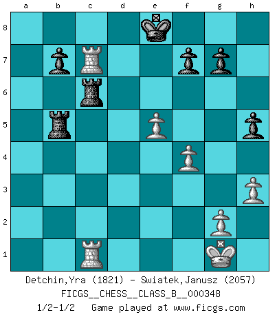 Last move : 1/2-1/2 2022 January 17 19:38:38 [Event "FICGS__CHESS__CLASS_B__000348"] [Site "FICGS"] [Date "2021.12.14"] [Round "1"] [White "Detchin,Yra"] [Black "Swiatek,Janusz"] [Result "1/2-1/2"] [WhiteElo "1821"] [BlackElo "2057"] 1.e4 e5 2.Nf3 Nc6 3.Bb5 Nf6 4.O-O Nxe4 5.d4 Nd6 6.Bxc6 dxc6 7.dxe5 Nf5 8.Qxd8+ Kxd8 9.h3 Be7 10.Nc3 Nh4 11.Nxh4 Bxh4 12.Be3 Bd7 13.Ne4 Bf5 14.Ng5 Ke8 15.Nf3 Be7 16.Nd4 Bd7 17.c4 h5 18.f4 c5 19.Nb5 Bxb5 20.cxb5 a6 21.a4 Rh6 22.Rac1 axb5 23.axb5 Ra2 24.Bxc5 Bxc5+ 25.Rxc5 Rxb2 26.Rxc7 Rxb5 27.Rfc1 Rc6 1/2-1/2 Ruy Lopez : Berlin defense, Open variation Kingside Castling by player White (move 4) This chess game ended in a draw. Follow this game move after move (download)Becoming successful at Chess allows you to discover your own personality. That's what I want for the kids I teach. (Saudin Robovic) Kleine Schachspieler machen Mist, und große Schachspieler machen Mist, aber große machen weniger Mist. (Fritz Sämisch) Sin errores no puede haber brillantez. (Emanuel Lasker) Dans le domaine de la peinture, de la gravure et de la sculpture, dès la première décennie de notre siècle, les artistes abandonnent la représentation de la partie d'échecs pour se concentrer sur les pièces, sur les échiquiers et sur toutes les variations auxquelles les unes et les autres peuvent donner lieu. On passe en quelque sorte d'un thème social à un thème musical (au sens de la musica médiévale, c'est-à-dire d'une notion qui inclue le rythme, l'harmonie, la construction et la déconstruction, etc.). Graphiquement et picturalement, l'échiquier apparaît comme une structure ouverte, dynamique, d'une richesse infinie, autorisant toutes les combinatoires et débouchant sur des mouvements et des rythmes de nature exponentielle. (Michel Pastoureau) Mandala - that's it! 16x16 squares as multiple of the four and the eight because of the Four Noble Truths and the Noble Eightfold Path. (Heinz-Georg Lehnhoff about Big Chess)