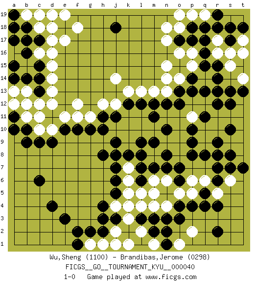 Last move : 1-0 2007 November 13 16:56:59 [Event "FICGS__GO__TOURNAMENT_KYU__000040"] [Site "FICGS"] [Date "2007.07.25"] [Round "1"] [Black "Wu,Sheng"] [White "Brandibas,Jerome"] [Result "1-0"] [Rating 1 "1100"] [Rating 2 "0298"] 1.q16 d16 2.q4 o16 3.d4 q14 4.o17 n17 5.p17 p16 6.q15 p15 7.r14 o18 8.p18 n18 9.r13 p19 10.q18 q19 11.r19 o19 12.r18 r11 13.p14 o14 14.p13 q12 15.q13 p12 16.o12 n15 17.r7 o11 18.o13 n14 19.p10 p11 20.m12 m13 21.n12 o10 22.p9 o9 23.p8 l11 24.l12 l13 25.k12 j12 26.m9 m8 27.n8 n9 28.l9 o8 29.n7 m10 30.l7 k11 31.j11 k13 32.o7 k9 33.l8 k10 34.h11 j14 35.f10 h12 36.h8 q10 37.r9 r10 38.r12 n11 39.m11 l10 40.j8 q9 41.q8 s9 42.r8 s11 43.s12 t10 44.s8 t9 45.j9 t12 46.t13 t11 47.k8 s15 48.r15 s16 49.s17 t14 50.s13 t8 51.t7 f12 52.c14 c12 53.c17 c16 54.b16 d17 55.b18 c18 56.b17 d19 57.c15 d15 58.c6 b13 59.c13 d13 60.b14 a12 61.a15 d14 62.a14 a13 63.c9 b11 64.e3 g11 65.g10 f11 66.e10 e11 67.d11 d12 68.b10 d10 69.d9 c11 70.a10 c10 71.a11 b12 72.b9 k4 73.m3 m4 74.l3 k3 75.n3 l4 76.h3 j2 77.h2 l2 78.m2 k1 79.j3 h1 80.g2 g1 81.f1 j1 82.f2 m1 83.n1 n4 84.o3 m6 85.m7 n6 86.l6 l5 87.o6 o5 88.n5 m5 89.o4 p5 90.q5 k6 91.j5 k5 92.j6 b19 93.a18 j10 94.h10 t17 95.t18 t16 96.e18 d18 97.j18 f18 98.a19 c19 99.n10 r17 100.s18 r16 101.q17 n13 102.q11 s6 103.s7 r5 104.r4 q6 105.r6 p6 106.p4 o1 107.n2 j4 108.h4 e17 109.pass a16 110.a17 e19 111.pass k7 112.j7 p11 113.s10 p2 114.r2 1-0 Here are the names of the openings (joseki) played in the four corners : Corner q16 : q16 o16 Hoshi (Hwajeom, Seongjeom, Xingwei`) 4-4 Point. The star or hoshi (4-4) point, emphasizing influence at the potential expense of territory. Ikken Takagakari (Hankan Nop'dakeolch'im, Yi Gaojia, 1-Space High Approach). Black typically responds at 6-4 or 3-10. Black 4-10 is played when Black finds play on the right side advantageous. Black 4-8 or 3-8 may be played when Black has support at top. Player Black won this Go (weiqi, baduk) game. Follow this game move after move (download)Territory really exists only in the end. (Pierre Audouard) At work, the authority of a person is inversely proportional to the number of pens that person is carrying. (Dan Rotaru)