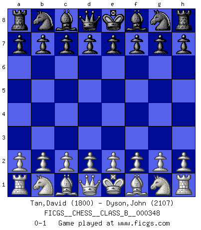 Last move : 0-1 2022 January 24 1:17:21 [Event "FICGS__CHESS__CLASS_B__000348"] [Site "FICGS"] [Date "2021.12.14"] [Round "1"] [White "Tan,David"] [Black "Dyson,John"] [Result "0-1"] [WhiteElo "1800"] [BlackElo "2107"] 0-1 This chess game has been lost on time (started : 2021.12.14 13:40:9) Player Black won this chess game. Follow this game move after move (download)My style is somewhere between that of Tal and Petrosian. (Reshevsky) Schach ist die gewalttätigste aller Sportarten. (Garry Kasparov) El Ajedrez moderno está demasiado preocupado con cosas como la estructura de Peones. Olvidenlo, el Jaque Mate termina la partida. (Nigel Short) Karpov est une pièce de musée. (Garry Kasparov) Luck has a peculiar habit of favoring those who don't depend on it. (Author unknown)