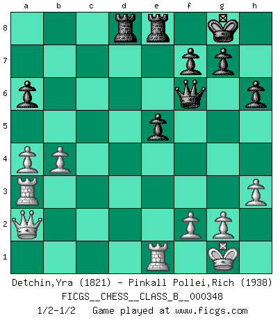 Last move : 1/2-1/2 2022 January 25 5:41:37 [Event "FICGS__CHESS__CLASS_B__000348"] [Site "FICGS"] [Date "2021.12.14"] [Round "1"] [White "Detchin,Yra"] [Black "Pinkall Pollei,Rich"] [Result "1/2-1/2"] [WhiteElo "1821"] [BlackElo "1938"] 1.e4 e5 2.Nf3 Nc6 3.Bb5 a6 4.Ba4 Nf6 5.O-O Be7 6.Re1 b5 7.Bb3 d6 8.c3 O-O 9.h3 Bb7 10.d4 Re8 11.Nbd2 Bf8 12.a4 h6 13.d5 Nb8 14.c4 bxc4 15.Bxc4 c6 16.dxc6 Bxc6 17.b3 Bb7 18.Ba3 Nbd7 19.Nh4 d5 20.exd5 Bxa3 21.Rxa3 Nxd5 22.Ne4 Qxh4 23.Bxd5 Bxd5 24.Qxd5 Nf6 25.Nxf6+ Qxf6 26.b4 Rad8 27.Qa2 1/2-1/2 Ruy Lopez : Closed Kingside Castling by player White (move 5) Kingside Castling by player Black (move 8) This chess game ended in a draw. Follow this game move after move (download)Fischer prefers to enter Chess history alone. (Miguel Najdorf) Ich möchte Schüler heranbilden, die das Vermögen haben, selbst zu denken und Kritik zu üben. (Emanuel Lasker) El Ajedrez es un terrible juego. Si no controlas el centro, tu oponente tiene una posición mas holgada. Si tienes control del centro, ¡entonces realmente tu tienes algo de que preocuparte!. (Siegbert Tarrasch) Aucun coup ne doit être joué sans but. (Pedro Damiano) Quotation,n.: The act of repeating erroneously the words of another. The words erroneously repeated. (Ambrose Bierce, The Devil's Dictionary)
