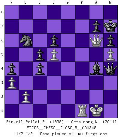 Last move : 1/2-1/2 2022 February 1 6:36:2 [Event "FICGS__CHESS__CLASS_B__000348"] [Site "FICGS"] [Date "2021.12.14"] [Round "1"] [White "Pinkall Pollei,Rich"] [Black "Armstrong,Keith"] [Result "1/2-1/2"] [WhiteElo "1938"] [BlackElo "2011"] 1.e4 e5 2.Nf3 Nc6 3.Bc4 Bc5 4.c3 Nf6 5.d3 O-O 6.O-O d6 7.Nbd2 a5 8.Re1 Be6 9.Bb5 Qb8 10.Nf1 Qa7 11.Be3 Bxe3 12.Nxe3 Ne7 13.Ba4 Ng6 14.Bc2 a4 15.d4 b5 16.a3 h6 17.h3 Qb7 18.Nh2 Rad8 19.Qf3 c5 20.d5 Bc8 21.c4 bxc4 22.Rab1 Nh7 23.Qe2 Bd7 24.Nhf1 Bb5 25.g3 Ne7 26.h4 Qa6 27.Qd2 Nf6 28.Qc3 Nd7 29.Rbd1 Rb8 30.Nd2 Nb6 31.f4 exf4 32.gxf4 f5 33.Re2 Rf7 34.Rg2 Qb7 35.Ndf1 Bd7 36.Ng3 Kh8 37.R1d2 Rg8 38.Bb1 Bc8 39.Qc2 Rgf8 40.h5 Qb8 41.Rgf2 Bd7 42.Rd1 Qd8 43.Re2 Qb8 44.Ng2 Re8 45.Rde1 Qd8 46.Ne3 Rg8 47.Rg2 Re8 48.Rge2 Kg8 49.Qd1 Qa8 50.Ngxf5 Nxf5 51.exf5 Kf8 52.f6 Rxf6 53.Qd2 Qd8 54.Qc2 Rxe3 55.Rxe3 Rxf4 56.Qg2 Rg4 57.Rg3 Qh4 58.Rf1+ Kg8 59.Rxg4 Bxg4 60.Bh7+ Kxh7 61.Qe4+ Kg8 62.Qe8+ Kh7 63.Qg6+ Kg8 64.Qf7+ Kh7 65.Qg6+ 1/2-1/2 Giuoco Piano Kingside Castling by player Black (move 5) Kingside Castling by player White (move 6) This chess game ended in a draw. Follow this game move after move (download)Live, lose, and learn, by observing your opponent how to win. (Amber Steenbock) Es hat in meinem Leben Zeiten gegeben, da ich sehr nahe daran war zu glauben, daß ich auch nicht eine einzige Schachpartie verlieren könnte. (José Raúl Capablanca) Yo adoro todas la posiciones. Denme una partida posicional difícil, y la jugaré. Pero posiciones totalmente ganadas, no las tolero. (Hein Donner) A ce moment-là, je menaçais de comprendre la position ! (Clément L'Heureux) A mistake is only a mistake if you let it happen twice. Otherwise it is a learning experience. (Daniel Parmet)