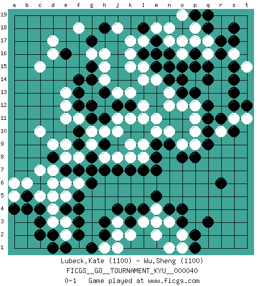 Last move : 0-1 2007 September 2 22:28:6 [Event "FICGS__GO__TOURNAMENT_KYU__000040"] [Site "FICGS"] [Date "2007.07.25"] [Round "1"] [Black "Lubeck,Kate"] [White "Wu,Sheng"] [Result "0-1"] [Rating 1 "1100"] [Rating 2 "1100"] 1.r16 d16 2.q3 d4 3.r6 p17 4.p16 o16 5.p15 q17 6.r17 k17 7.k4 r14 8.q14 r13 9.r11 q16 10.q15 r15 11.q18 p18 12.q19 o17 13.s18 s16 14.s17 t15 15.q12 q13 16.p13 s11 17.s10 r10 18.s12 p12 19.o13 t11 20.t12 r12 21.q11 p14 22.o15 k15 23.f3 d6 24.k10 n3 25.o4 m4 26.n4 l3 27.m5 j2 28.k3 k2 29.h3 c10 30.o3 o2 31.n2 m2 32.m3 n15 33.o14 n3 34.l4 m3 35.p2 n1 36.g6 m10 37.m12 l11 38.l10 m11 39.k12 l12 40.l13 n12 41.m13 p11 42.q10 p10 43.q9 n13 44.n14 m14 45.m15 l14 46.n16 n17 47.m17 m18 48.l18 l17 49.m16 n18 50.s14 k13 51.m9 h8 52.j7 k11 53.n9 p9 54.p8 l8 55.o8 j8 56.k7 l9 57.m7 c15 58.g8 g10 59.h7 g9 60.c3 d3 61.c4 c5 62.b5 b6 63.d2 e2 64.c2 e3 65.b4 e8 66.f4 j3 67.j4 f8 68.g7 d17 69.h2 a5 70.a4 a6 71.d1 h1 72.g1 j1 73.f2 k8 74.l7 o12 75.s15 e5 76.f5 f6 77.f7 e6 78.e7 d7 79.e4 n10 80.m8 o9 81.e1 d5 82.d8 c7 83.f9 e9 84.f10 d9 85.h9 j10 86.p1 o1 87.p19 o19 88.l16 k16 89.s13 l15 90.n15 k9 91.g17 j18 92.h18 f18 93.g11 h10 94.f14 f11 95.f12 e11 96.h13 h15 97.g15 h14 98.g14 h16 99.h11 e13 100.f13 e12 101.j12 j13 102.g12 j11 103.e16 g16 104.pass pass 0-1 Here are the names of the openings (joseki) played in the four corners : Corner q16 : r16 p17 Komoku (Somok, Xiao~mu`) 3-4 Point. The komoku (3-4) point is the traditional corner enclosure move.. Ikken Kakari (Hankan Keolch'im, Yi Gua`jiao~, 1-Space Low Pincer). The small knight move is the basic approach move to the 3-4 point stone. It has been continually used for over four centuries. There are limitless variations, with new moves constantly being discovered. White 2 opens the door to a treaure store of joseki. Corner d4 : d4 f3 Hoshi (Hwajeom, Seongjeom, Xingwei`) 4-4 Point. The star or hoshi (4-4) point, emphasizing influence at the potential expense of territory. Ikken Kakari (Hankan Keolch'im, Yi Gua`jiao~, 1-Space Low Approach). Black 2 is the standard approach move to the 4-4. Player White won this Go (weiqi, baduk) game. Follow this game move after move (download)While the Baroque rules of chess could only have been created by humans, the rules of go are so elegant, organic, and rigorously logical that if intelligent life forms exist elsewhere in the universe, they almost certainly play go. (Edward Lasker, international chess master) Everybody lies. (Gregory House, House M.D.)