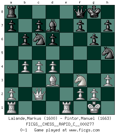 Last move : 0-1 2022 February 13 6:59:35 [Event "FICGS__CHESS__RAPID_C__000277"] [Site "FICGS"] [Date "2021.12.16"] [Round "1"] [White "Lalande,Markus"] [Black "Pintor,Manuel"] [Result "0-1"] [WhiteElo "1600"] [BlackElo "1663"] 1.c4 e5 2.Nc3 Bc5 3.e3 Nc6 4.Nf3 d6 5.d4 exd4 6.exd4 Bb4 7.Qc2 Qe7+ 8.Be2 Bg4 9.Be3 Nf6 10.O-O Bxc3 11.Qxc3 O-O 12.Rfe1 Ne4 13.Qc2 Bf5 14.Qb3 b6 15.Qb5 Bd7 16.Qb3 Na5 17.Qc2 Nf6 18.Bd3 g6 19.Bh6 Qd8 20.Bxf8 Qxf8 21.h3 Nh5 22.b4 Nc6 0-1 This chess game has been lost on time (started : 2021.12.16 7:33:13) English Opening Kingside Castling by player White (move 10) Kingside Castling by player Black (move 11) Player Black won this chess game. Follow this game move after move (download)You cannot play at Chess if you are kind-hearted. (French Proverb) Ich liebe den Moment, wenn ich das Ego meines Gegenüber breche. (Robert James Fischer) Creo que una cierta cantidad de temperamento es esperada de los genios del Ajedrez. (Ron Gross) Vous m'avez demandé de vous exposer quel est le fondement de la prière. Je ne fais que préparer les pièces du jeu sur la table... Nous sera-t-il permis d'en adopter les règles et si nous les appliquons scrupuleusement nous ne tarderons pas à faire mat le Roi divin ! Il ne pourra échapper à nos mains. (Sainte Thérèse d'Avila, Chemin de perfection) Always remember that you are unique; just like everyone else. (Unknown)