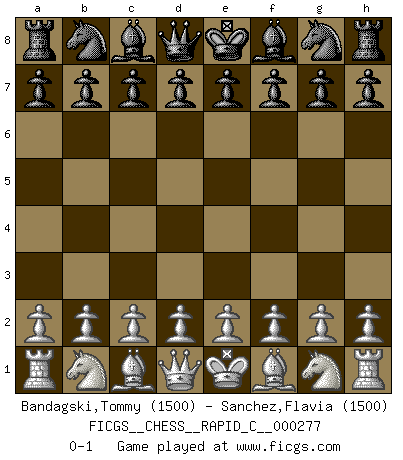 Last move : 0-1 2022 January 15 20:26:7 [Event "FICGS__CHESS__RAPID_C__000277"] [Site "FICGS"] [Date "2021.12.16"] [Round "1"] [White "Bandagski,Tommy"] [Black "Sanchez,Flavia"] [Result "0-1"] [WhiteElo "1500"] [BlackElo "1500"] 0-1 This chess game has been lost on time (started : 2021.12.16 7:33:13) Player Black won this chess game. Follow this game move after move (download)We must make sure that Chess will not be like a dead language, very interesting, but for a very small group. (Sytze Faber) Im Wettkampf zwischen starken Meistern kommen Fehler sehr selten vor, deshalb ist es mit bloßem Warten nicht getan. (José Raúl Capablanca) No volvere nunca a jugar contigo. Has insultado a mi amigo. - cuando un oponente se maldijo por una mala jugada (Miguel Najdorf) Les écrivains ont utilisé les échecs pour analyser les côtés extrêmes de la nature humaine. Dans ce cadre, les échecs offrent un champ d'expérimentation idéal. Mais on pourrait faire la même chose avec la peinture. Et là, en vous référant à Van Gogh, vous ne tirerez pas de conclusion définitive sur les peintres. (Gary Kasparov) Life is like a play: it's not the length but the excellence of the acting that matters. (Seneca)