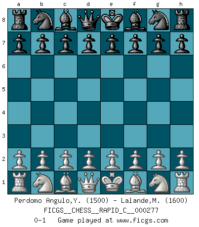 Last move : 0-1 2022 January 15 20:26:7 [Event "FICGS__CHESS__RAPID_C__000277"] [Site "FICGS"] [Date "2021.12.16"] [Round "1"] [White "Perdomo Angulo,Yorvis Antonio"] [Black "Lalande,Markus"] [Result "0-1"] [WhiteElo "1500"] [BlackElo "1600"] 0-1 This chess game has been lost on time (started : 2021.12.16 7:33:13) Player Black won this chess game. Follow this game move after move (download)Discovered check is the dive bomber of the Chessboard. (Reuben Fine) Das Schach ist nichts für kleine Geister, es beansprucht einen vollen Mann, der sich nicht sklavisch an das Überlieferte hält, sondern selbständig die Tiefen des Spiels zu ergründen sucht. (Wilhelm Steinitz) Cualquier cambio de material en una posición debe venir por medio de un mate, una captura o promoción de Peón. (Purdy) Les Echecs ont trois composantes : le temps, l'espace et le matériel en dernier. (Mikhail Tal) Is not life a hundred times too short to bore ourselves ? (Friedrich Nietzsche)