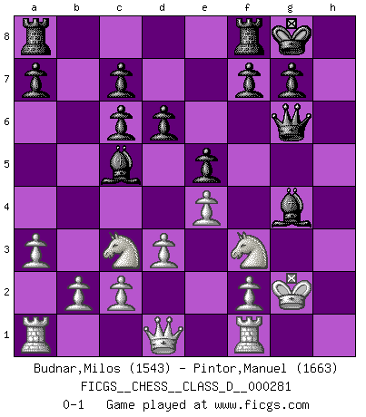 Last move : 0-1 2021 December 30 19:6:26 [Event "FICGS__CHESS__CLASS_D__000281"] [Site "FICGS"] [Date "2021.12.16"] [Round "1"] [White "Budnar,Milos"] [Black "Pintor,Manuel"] [Result "0-1"] [WhiteElo "1543"] [BlackElo "1663"] 1.e4 e5 2.Nf3 Nc6 3.Bb5 Qf6 4.O-O Bc5 5.d3 d6 6.h3 Nge7 7.Bg5 Qe6 8.Bxe7 Qxe7 9.Nc3 O-O 10.Nd5 Qd8 11.Bxc6 bxc6 12.Nc3 Qf6 13.a3 Qg6 14.g4 h5 15.Nh4 Qf6 16.Nf3 hxg4 17.hxg4 Bxg4 18.Kg2 Qg6 0-1 Ruy Lopez (Spanish Opening) Kingside Castling by player White (move 4) Kingside Castling by player Black (move 9) Player Black won this chess game. Follow this game move after move (download)It is the aim of the modern school, not to treat every position according to one general law, but according to the principle inherent in the position. (Richard Reti) Ich rechne überhaupt nicht voraus. Ich gewinne auch so. (Robert James Fischer) Las ideas audaces son como las piezas del Ajedrez que avanzan hacia adelante. Ellas pueden ser vencidas, pero también pueden iniciar una partida victoriosa. (Goethe) Le système Elo représente seulement une moyenne. Il est simplement un indicateur de votre stabilité. (Anatoli Karpov) Thus, what is of supreme importance in war is to attack the enemy's strategy. (Sun Tzu)
