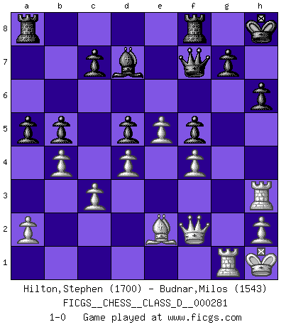 Last move : 1-0 2022 January 11 7:11:5 [Event "FICGS__CHESS__CLASS_D__000281"] [Site "FICGS"] [Date "2021.12.16"] [Round "1"] [White "Hilton,Stephen"] [Black "Budnar,Milos"] [Result "1-0"] [WhiteElo "1700"] [BlackElo "1543"] 1.d4 Nf6 2.Nf3 e6 3.Bf4 h6 4.e3 Bb4+ 5.c3 Ba5 6.Nbd2 O-O 7.Nc4 Nc6 8.Nxa5 Nxa5 9.b4 Nc6 10.Bd3 Nd5 11.Qc2 Nxf4 12.exf4 f5 13.O-O d5 14.Rfe1 Qf6 15.Ne5 Nxe5 16.fxe5 Qe7 17.f4 a6 18.Re3 Qh4 19.Rf3 Qh5 20.Qf2 b5 21.Rf1 Bd7 22.Rh3 Qg6 23.Kh1 a5 24.g4 Qf7 25.gxf5 exf5 26.Rg1 Kh8 27.Be2 1-0 Queen's pawn game Kingside Castling by player Black (move 6) Kingside Castling by player White (move 13) Player White won this chess game. Follow this game move after move (download)We don't really know how the game was invented, though there are suspicions. As soon as we discover the culprits, we'll let you know. (Bruce Pandolfini) Die Jungen erwarten, dass Opa einfach umfällt. Dann aber kann Opa fünf Stunden lang Schach spielen und die jungen Gegner an die Wand drücken. (Viktor Kortschnoi) En manos de Fischer's, una diminuta ventaja teórica es tan buena como tener una Reina de ventaja. (Isaac Kashdan) Il vaut toujours mieux jouer un plan faux de façon logique que de n'avoir pas de plan du tout. (Victor Kortchnoï) The mind is like a parachute, it only functions when its open. (Unknown)