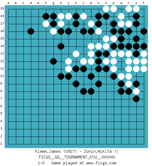 Last move : 1-0 2007 October 25 2:3:45 [Event "FICGS__GO__TOURNAMENT_KYU__000040"] [Site "FICGS"] [Date "2007.07.25"] [Round "1"] [Black "Klemm,James"] [White "Zonin,Nikita"] [Result "1-0"] [Rating 1 "0927"] 1.q16 q17 2.p17 r17 3.p16 s16 4.s15 r15 5.r16 s14 6.s17 t15 7.s18 p19 8.p14 q18 9.o18 o19 10.n18 p15 11.q15 o15 12.r14 r13 13.s15 t13 14.t16 q13 15.q14 n14 16.o13 r19 17.m16 m13 18.o11 o12 19.n12 p12 20.n11 p13 21.s12 r11 22.s13 r12 23.q8 o14 24.n13 m14 25.l11 k13 26.j16 j12 27.j10 k10 28.k11 j11 29.k9 l10 30.m10 l9 31.l8 m9 32.n9 m17 33.l16 l18 34.k17 l12 35.h10 s11 36.t14 s19 37.d16 t11 38.s9 r9 39.r8 r10 40.q9 q10 41.p10 p11 42.m8 n16 43.n17 j18 44.k18 t12 45.g12 s14 46.s13 s12 47.s14 s8 48.s7 h17 49.h16 g16 50.g17 f17 51.g18 h18 52.f18 m12 53.h14 1-0 This go game has been lost on time (started : 2007.07.25 20:23:31) Here are the names of the openings (joseki) played in the four corners : Corner q16 : q16 q17 Hoshi (Hwajeom, Seongjeom, Xingwei`) 4-4 Point. The star or hoshi (4-4) point, emphasizing influence at the potential expense of territory. Corner d16 : j16 j12 This joseki is unknown. A weak or weird move has probably been played in this corner. Corner q4 : q8 l9 This joseki is unknown. A weak or weird move has probably been played in this corner. Player Black won this Go (weiqi, baduk) game. Follow this game move after move (download)If you cannot succeed, then die gloriously. (Chinese proverb) I don't know, I don't care, and it doesn't make any difference. (Albert Einstein)