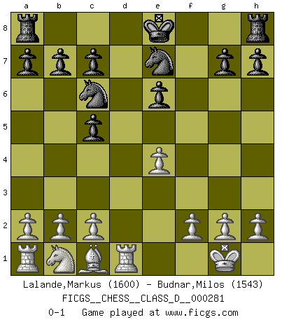 Last move : 0-1 2022 March 12 9:3:43 [Event "FICGS__CHESS__CLASS_D__000281"] [Site "FICGS"] [Date "2021.12.16"] [Round "1"] [White "Lalande,Markus"] [Black "Budnar,Milos"] [Result "0-1"] [WhiteElo "1600"] [BlackElo "1543"] 1.e4 e5 2.Nf3 Nc6 3.d4 exd4 4.Nxd4 Bc5 5.Nb3 d6 6.Nxc5 dxc5 7.Qxd8+ Kxd8 8.Bc4 Be6 9.Bxe6 fxe6 10.O-O Nge7 11.Rd1+ Ke8 0-1 This chess game has been lost on time (started : 2021.12.16 7:34:53) Scotch : Potter variation Kingside Castling by player White (move 10) Player Black won this chess game. Follow this game move after move (download)Daring ideas are like Chess men moved forward. They may be beaten, but they may start a winning game. (Johann Wolfgang von Goethe) Schach ist Krieg, im Schach geht es um testosterongesteuerte Urschreie. (Garry Kasparov) Tu cuerpo tiene que estar en óptima condición. Tu Ajedrez se deteriora como lo hace tu cuerpo. No puedes separar la mente y el cuerpo. (Bobby Fischer) Ce n'est pas pour s'amuser qu'il joue aux échecs : il célèbre un culte. (Vladimir Nabokov) Shallow men believe in luck. Strong men belive in cause and effect. (Ralph Waldo Emerson)